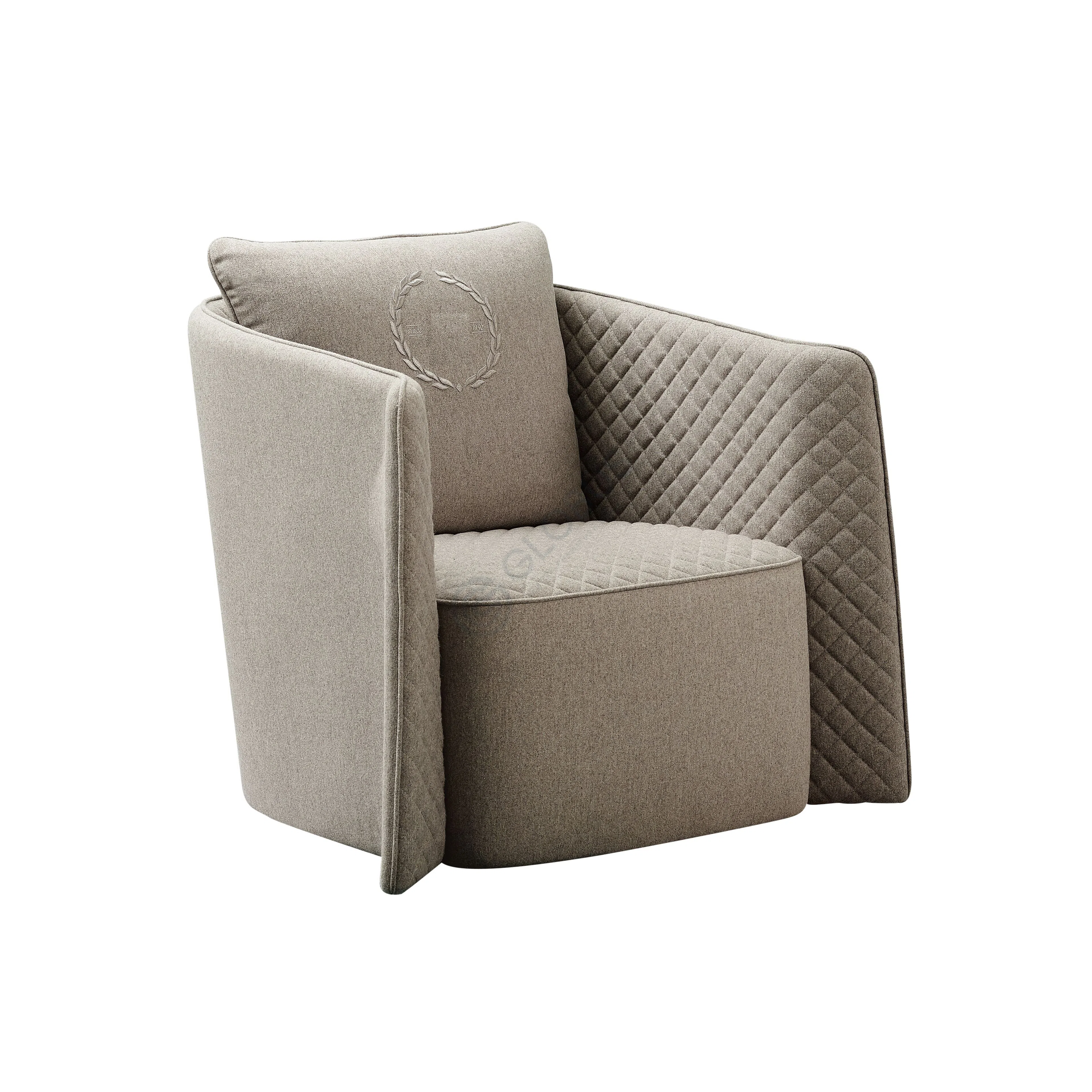 Силуэт предмета мебели отличается лаконичными формами и четкими линиями. Особую элегантность придают подлокотники с утонченной ромбовидной прострочкой, добавляющие уникальный акцент к общему облику. Благородная текстильная обивка приятного нейтрального оттенка подчеркивает высокий класс исполнения.
