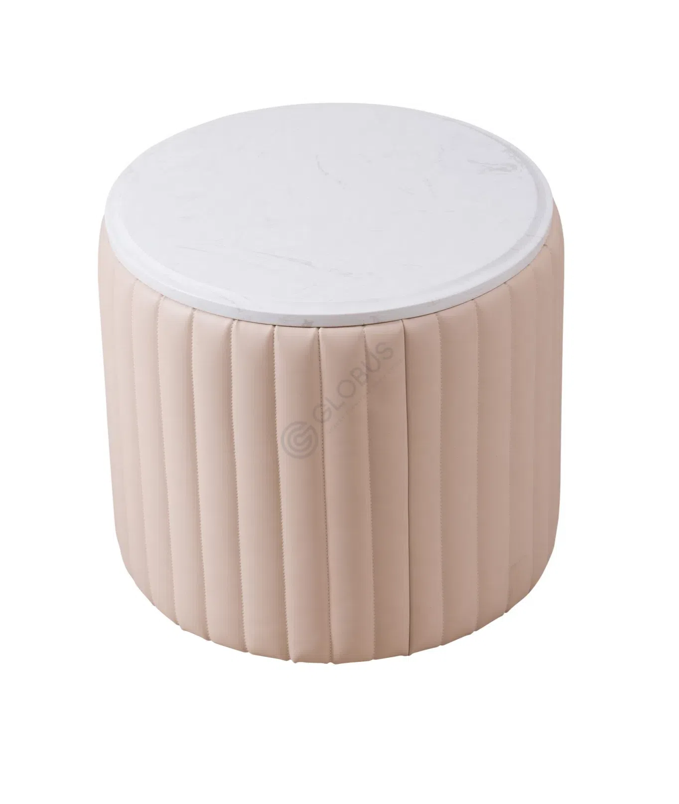 Круглая столешница, выполненная из искусственного мрамора, притягивает взгляд своей благородной текстурой с тонкими прожилками, добавляя интерьеру изысканности. Эта поверхность отличается не только внешней привлекательностью, но и практичностью, легко поддаваясь уходу. Боковая часть изделия обтянута высококачественной экокожей на микрофибре. Вертикальная рельефная стежка придает ей особый шарм, создавая ощущение глубины и тактильного комфорта.