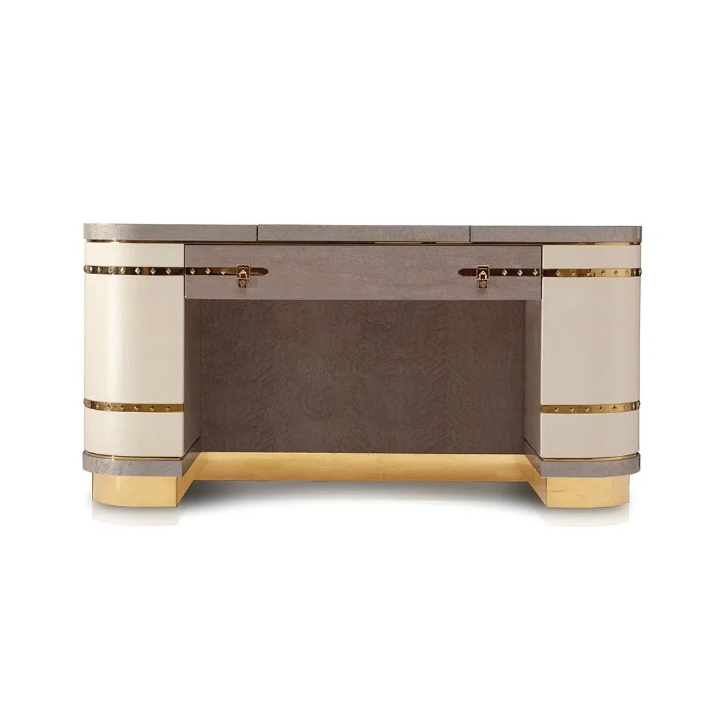 В основе конструкции лежит прочное натуральное дерево и фанера, обеспечивающие долговечность. Облицовка выполнена из премиальной экокожи на микрофибре, приятной на ощупь. Элементы из нержавеющей стали, включая уникальное основание и декоративные планки с заклепками, добавляют ноту современного гламура. Фурнитура ручек завершает образ своим оригинальным дизайном.