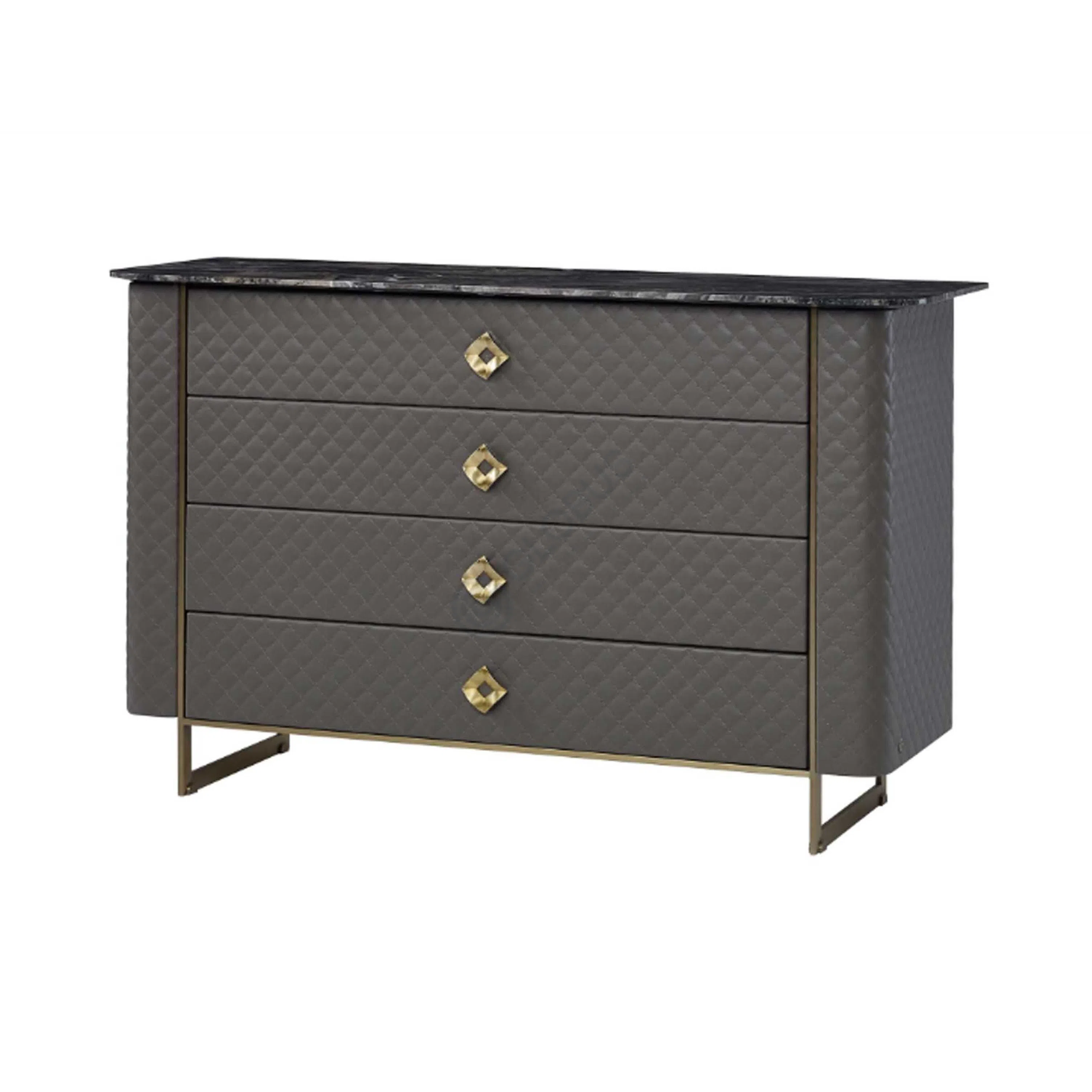 Буфет в современном стиле сочетает в себе продуманный дизайн и выразительные материалы. Фасады отделаны элегантной экокожей с фактурной диагональной стежкой, которая подчеркивает актуальность геометрии и создает ощущение уюта. Натуральный мрамор на столешнице вносит нотку роскоши и завершенности, а матовая поверхность приятна на ощупь и практична в использовании.