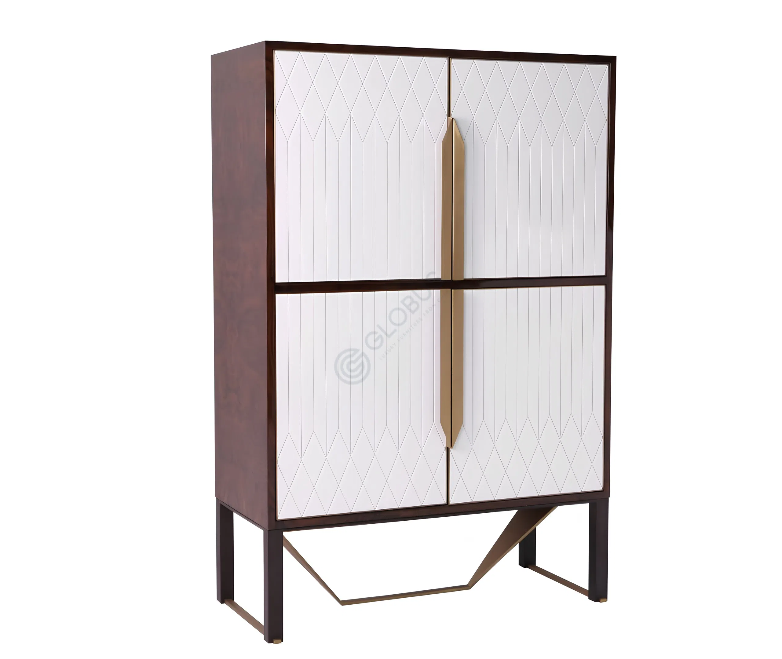 Корпус изделия выполнен из прочной фанеры, облицованной натуральным шпоном, что придает ему благородный вид и приятную текстуру. Фасадные части украшены декоративными панелями с уникальным узором, подчеркивающим внимание к деталям. Вертикальные ручки из полированной нержавеющей стали цвета золота не только обеспечивают удобство использования, но и служат ярким акцентом, завершающим образ.