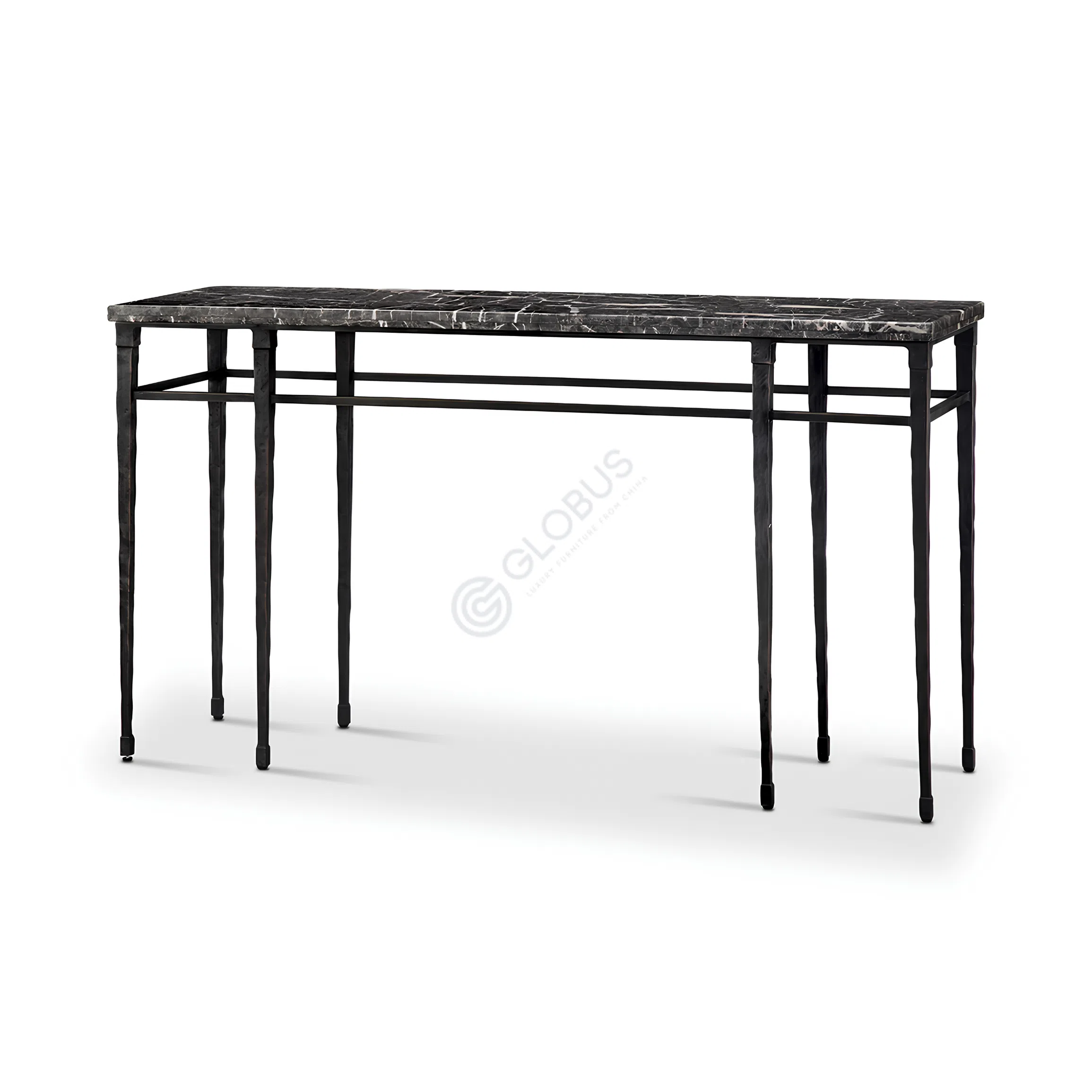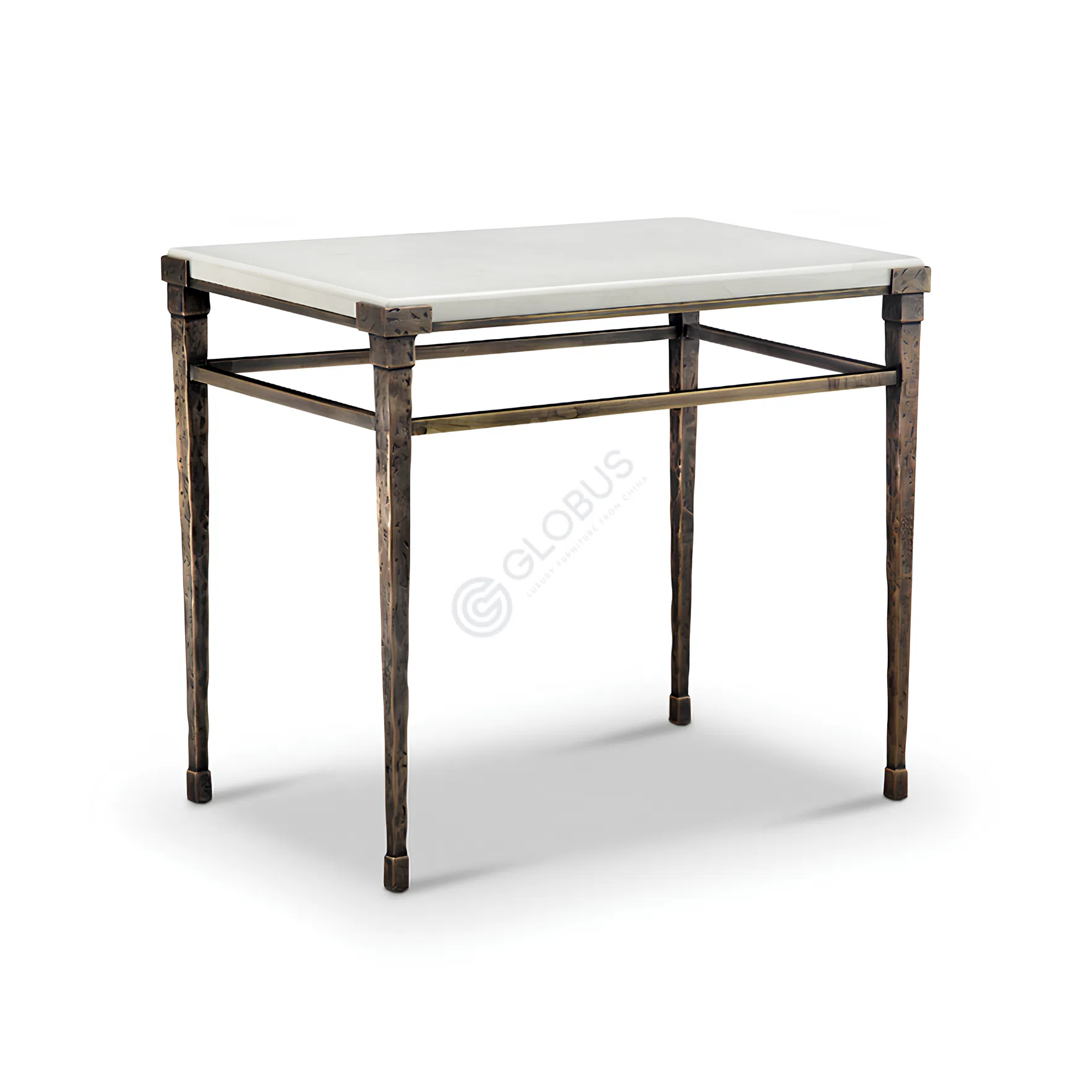 Основание выполнено из меди с темным покрытием и изящно сужающимися ножками. Угловые крепления выглядят лаконично и добавляют конструкции точности. Каменная плита отполирована до мягкого полуматового блеска, сохраняет чистоту линий и устойчива к ежедневному использованию при бережном уходе.