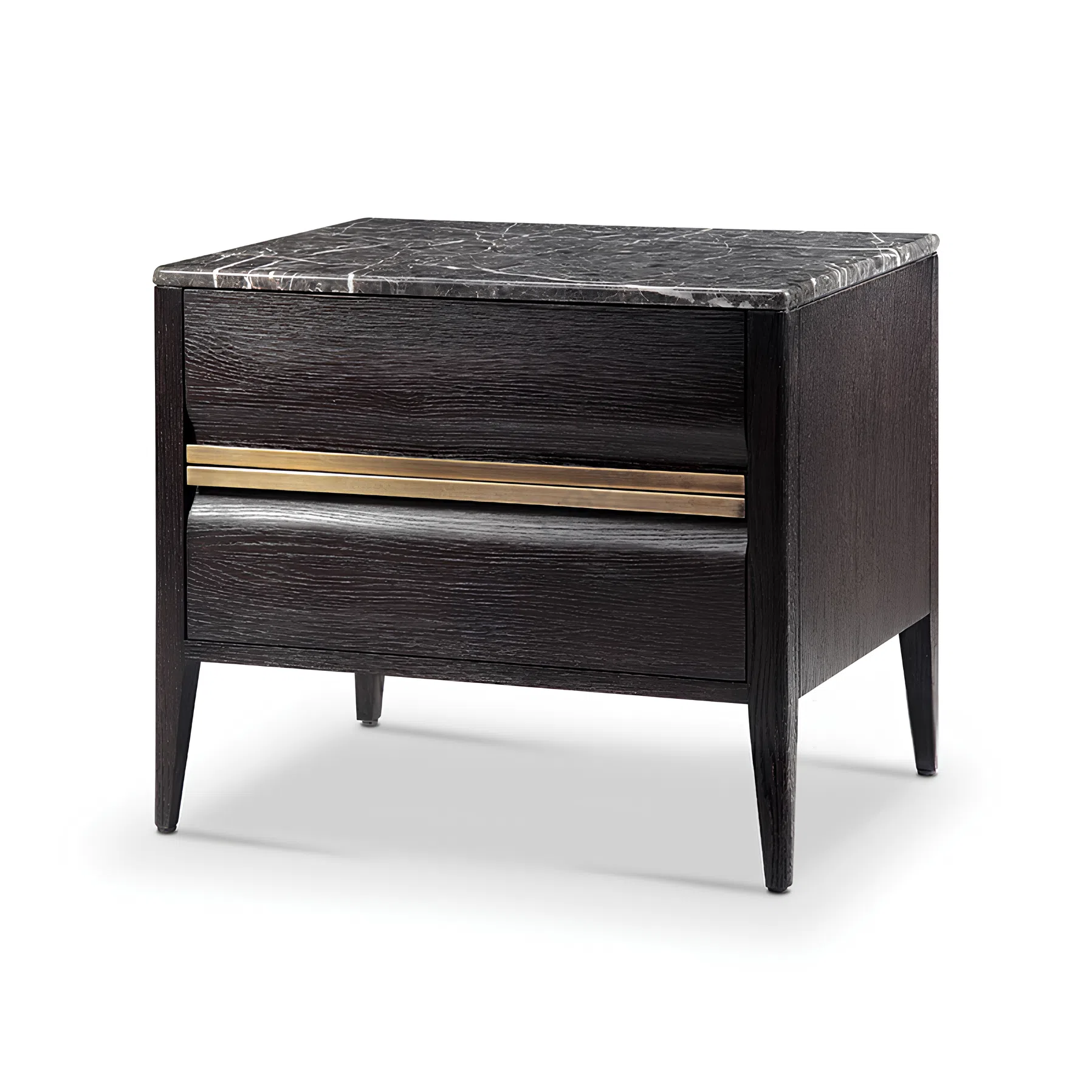 Корпус выполнен из натурального дерева с выразительной текстурой; стабильность конструкции обеспечивает МДФ в скрытых элементах. Вертикальные медные вставки на фасадах и опоры в том же металле добавляют тёплый блеск и создают чистый графический ритм.