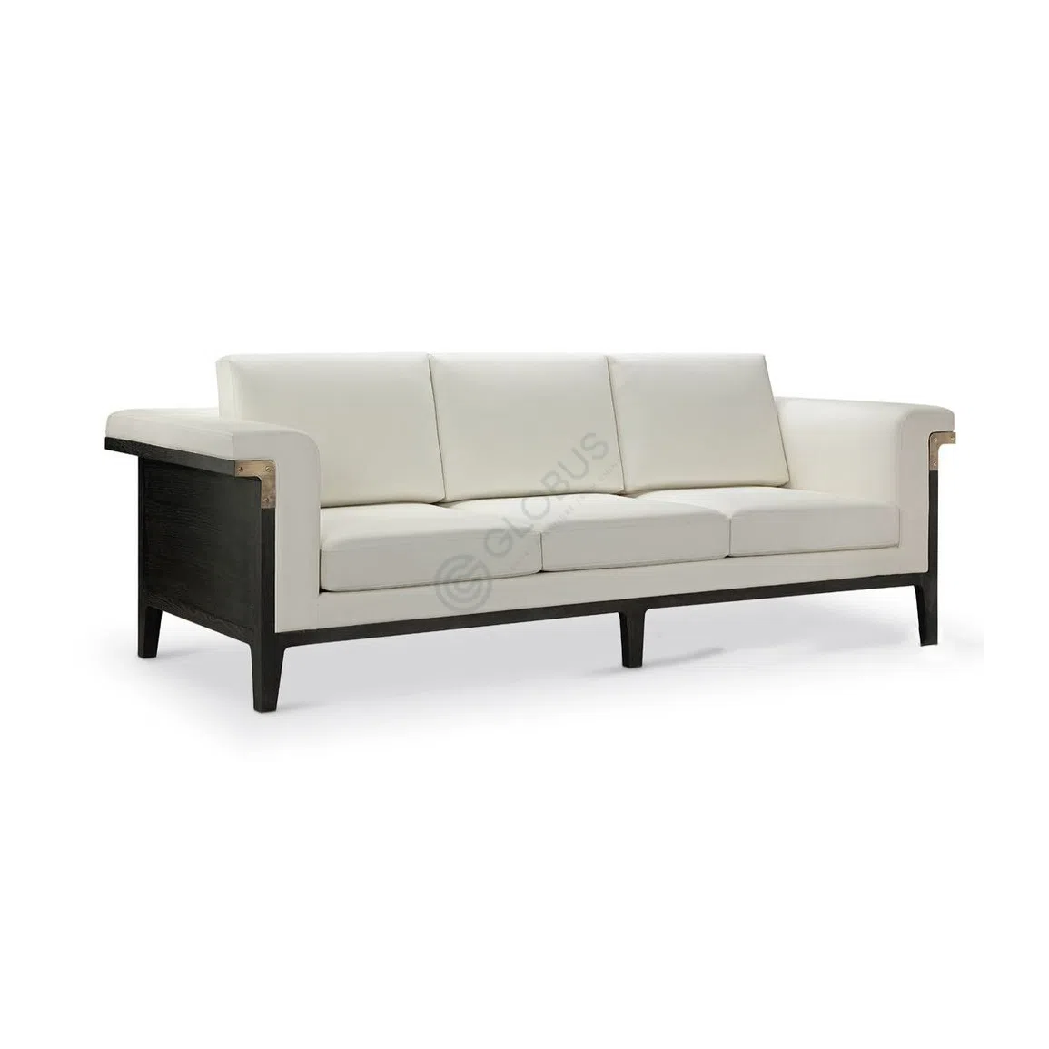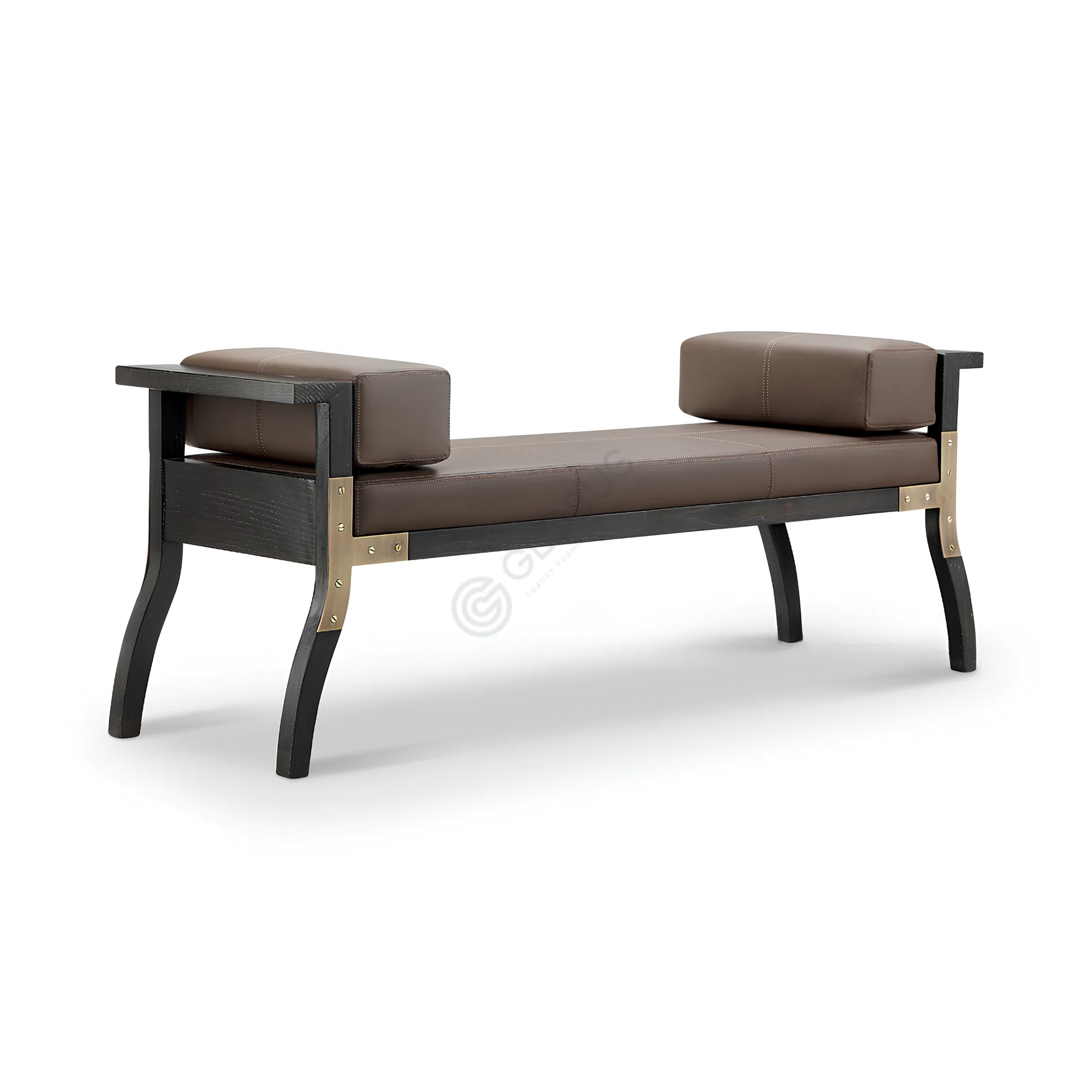 Каркас выполнен из натурального дерева с благородным темным тоном. Обивка из мягкого на ощупь текстиля отличается плотностью и стойким цветом, швы выверены и ровны. На стыке спинки и сиденья — тонкие медные накладки с открытым крепежом, создающие выразительный акцент и аккуратно фиксирующие конструкцию.