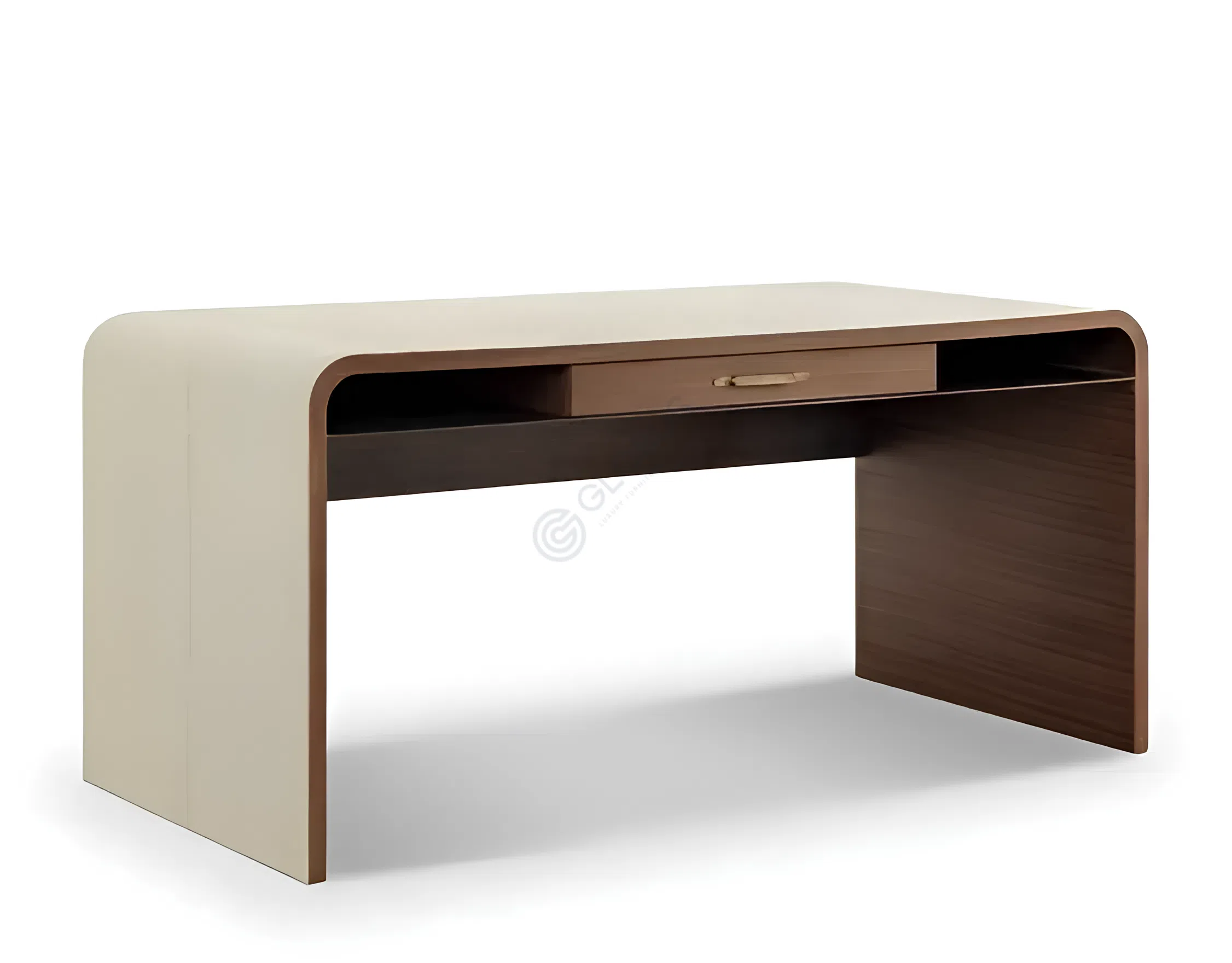Низкий журнальный столик с плавно скругленными кромками и цельной рамой подчеркивает современный характер гостиной. Верхняя плоскость отделана светлой кожей с аккуратной прострочкой, каркас выполнен из фанеры и облицован выразительным шпоном, создающим теплый естественный рисунок.