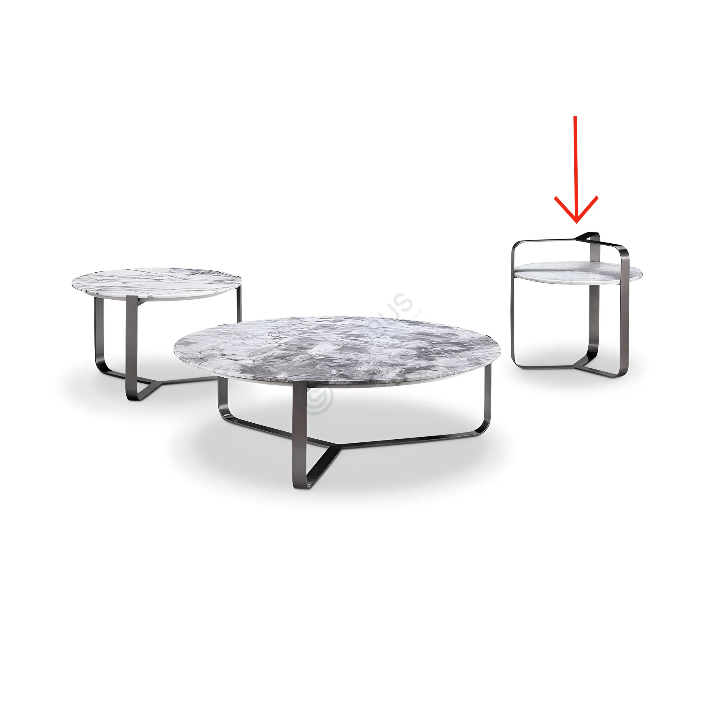 Основание столика выполнено из высококачественной нержавеющей стали. Металлическая конструкция имеет утонченную форму с плавными изгибами, создавая визуальную легкость и стабильную опору для тяжелой мраморной плиты. Отделка стали подчеркивает современный характер дизайна, добавляя сдержанного сияния.