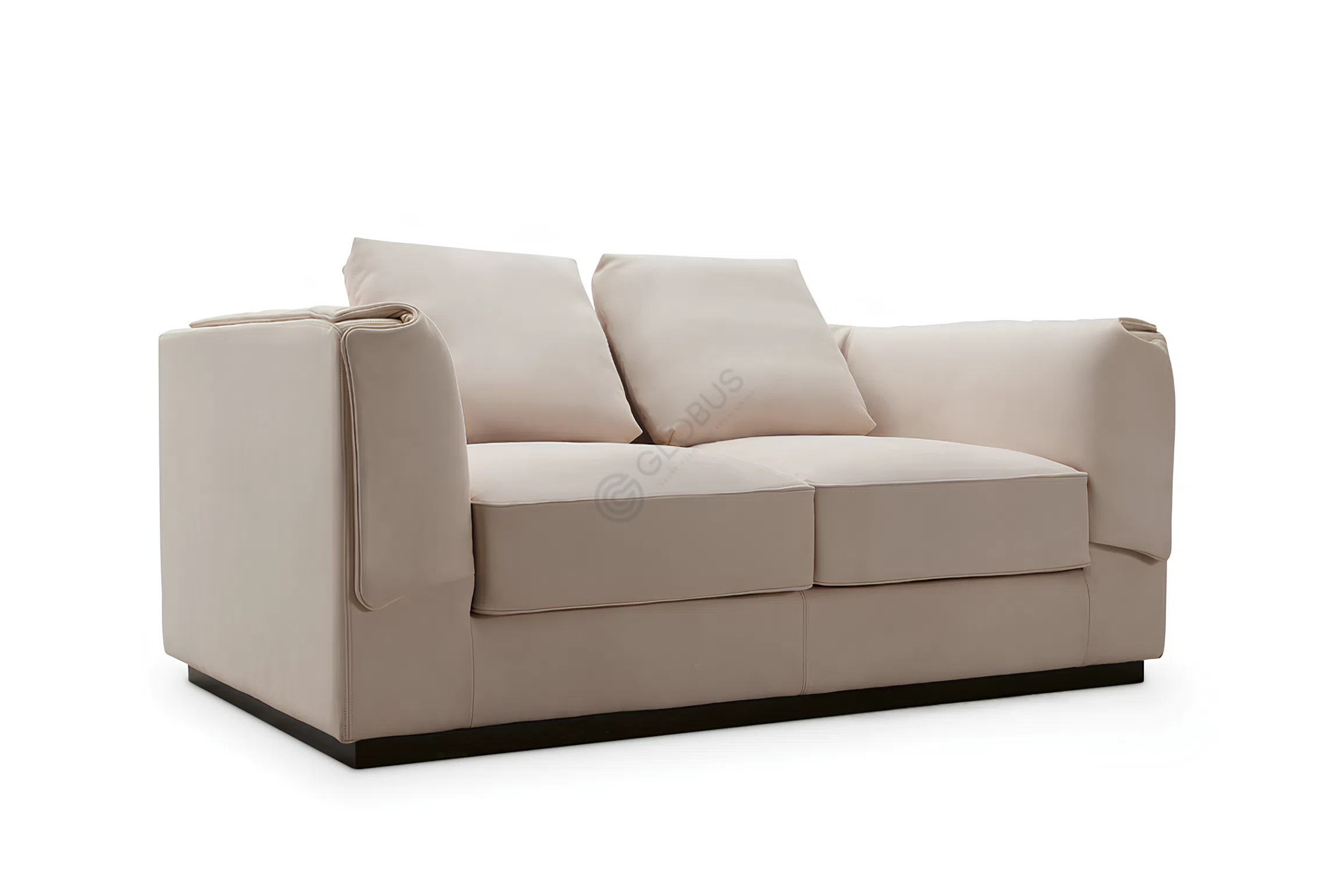Современное кресло с четкой геометрией и мягкими очертаниями. Обивка из экозамши нежного бежевого оттенка образует аккуратные напуски на подлокотниках, создавая расслабленный, уютный образ. Низкое основание из натурального дерева в темном тоне визуально облегчает объем и подчеркивает пропорции.