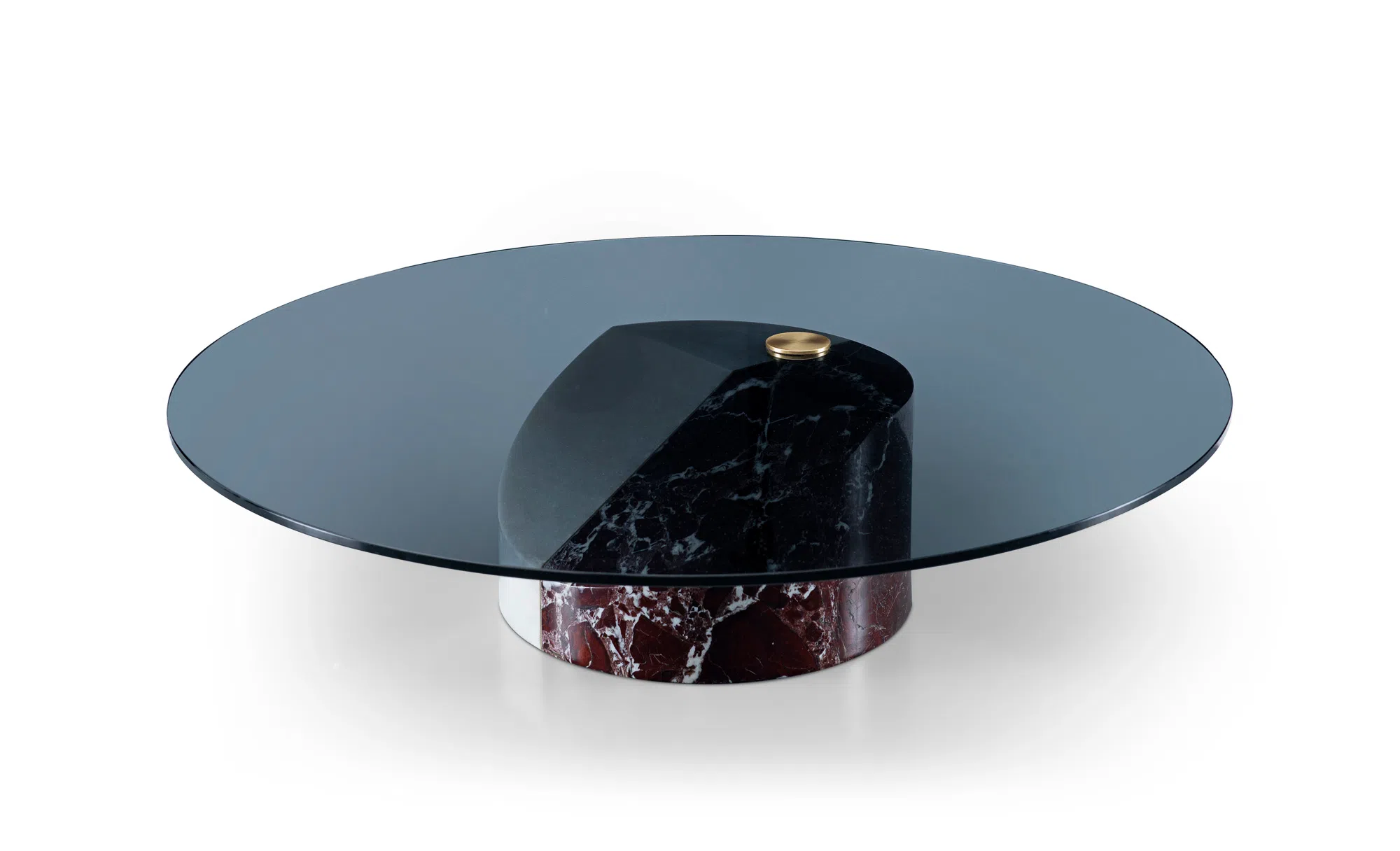 Круглая столешница из тонированного закалённого стекла парит над массивным основанием, обеспечивая визуальную лёгкость. Поверхность устойчива к царапинам и легко очищается от загрязнений. Модель сохраняет равновесие благодаря широкой базе и надёжному креплению.
