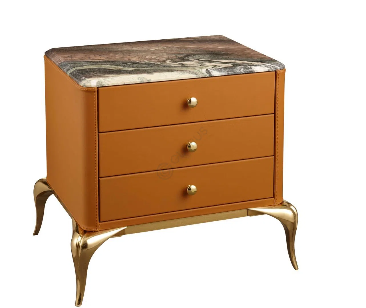 В изготовлении использованы натуральное дерево, качественная экокожа и сияющая латунь. Прочное деревянное основание обеспечивает надежность конструкции. Обивка из экокожи приятна на ощупь и придает изделию роскошный вид. Полированные латунные опоры, изгибающиеся подобно драгоценным лапам, добавляют блеск и завершают образ, подчеркивая принадлежность к премиум-сегменту.