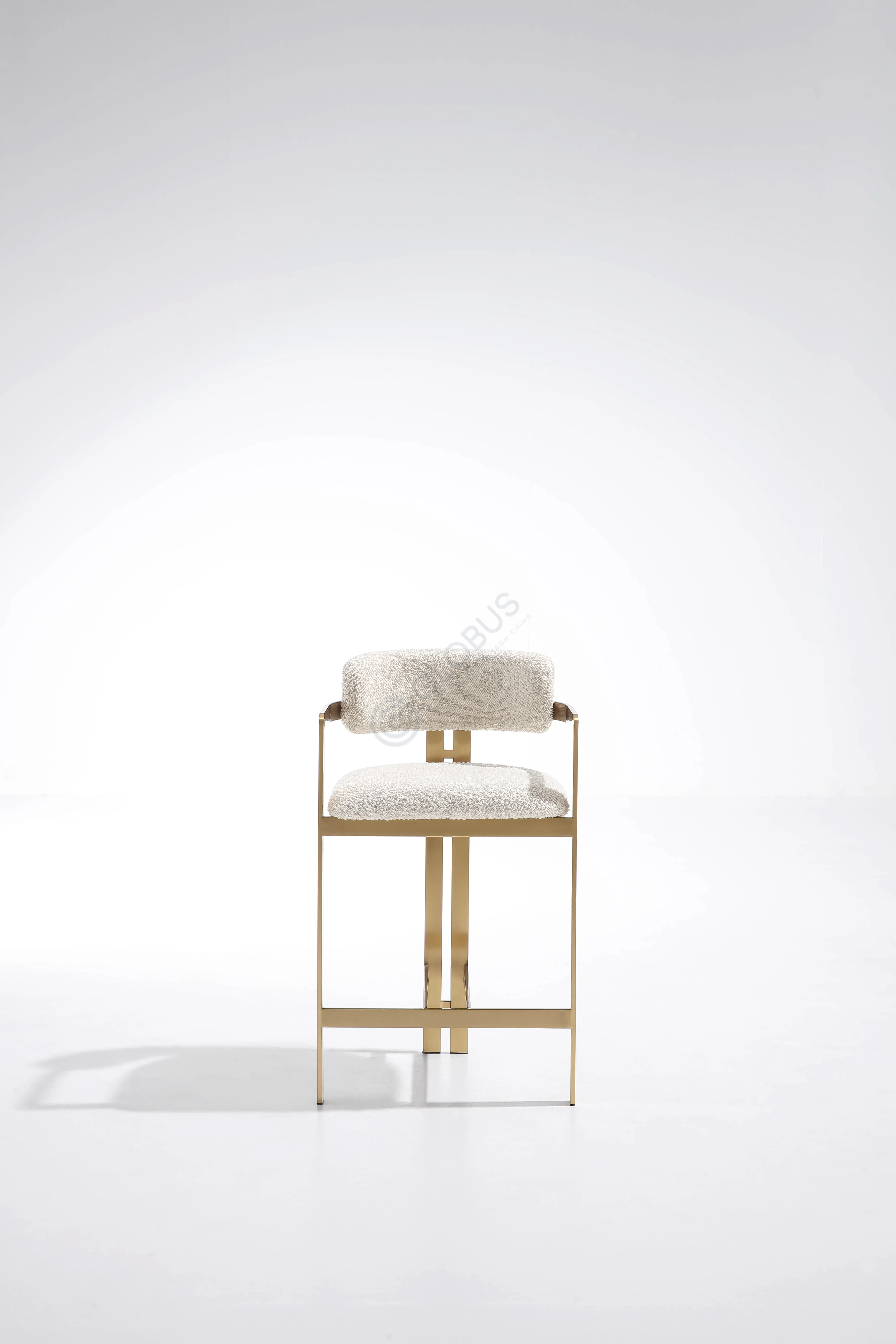 Каркас выполнен из натурального дерева с выразительной текстурой; подлокотники переходят в спинку единой линией, подчеркивая чистоту силуэта. Декоративно-конструктивные элементы из нержавеющей стали с сатинированной отделкой добавляют изысканности и повышают прочность соединений.