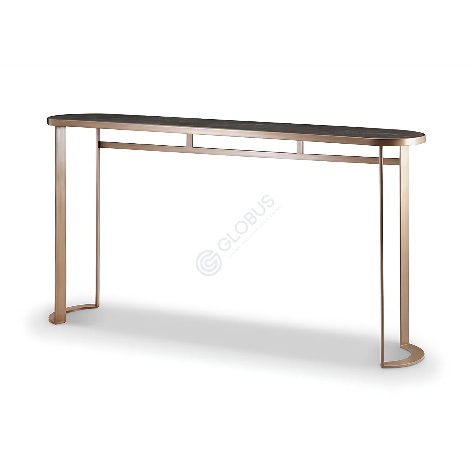 Угловой столик для гостиной с современным силуэтом: тонкая металлическая рама поддерживает прямоугольную плиту из натурального мрамора глубокого оттенка. Асимметричная геометрия с перекрестным основанием создает аккуратный акцент и позволяет удобно придвинуть предмет к дивану или креслу.