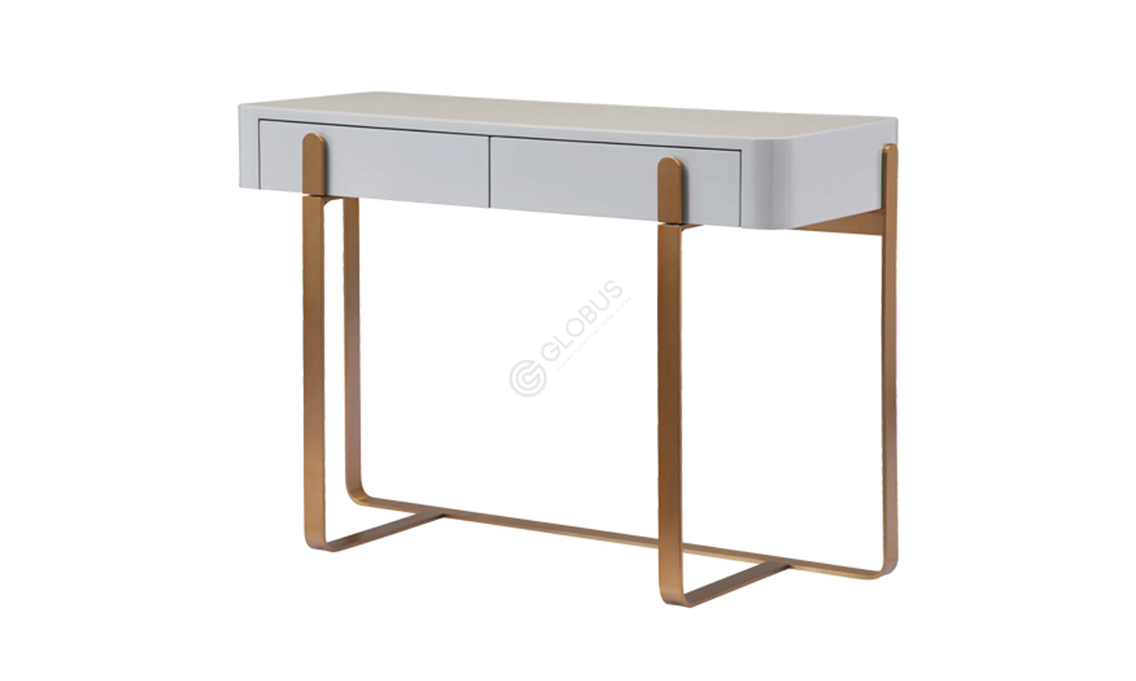 Опоры из нержавеющей стали формируют U-образные стойки и переходят в вертикальные декоративные планки на фронте, создавая ощущение легкости и устойчивости. Контраст тактильных материалов — кожа, дерево и сатинированный металл — выглядит сдержанно и дорого.