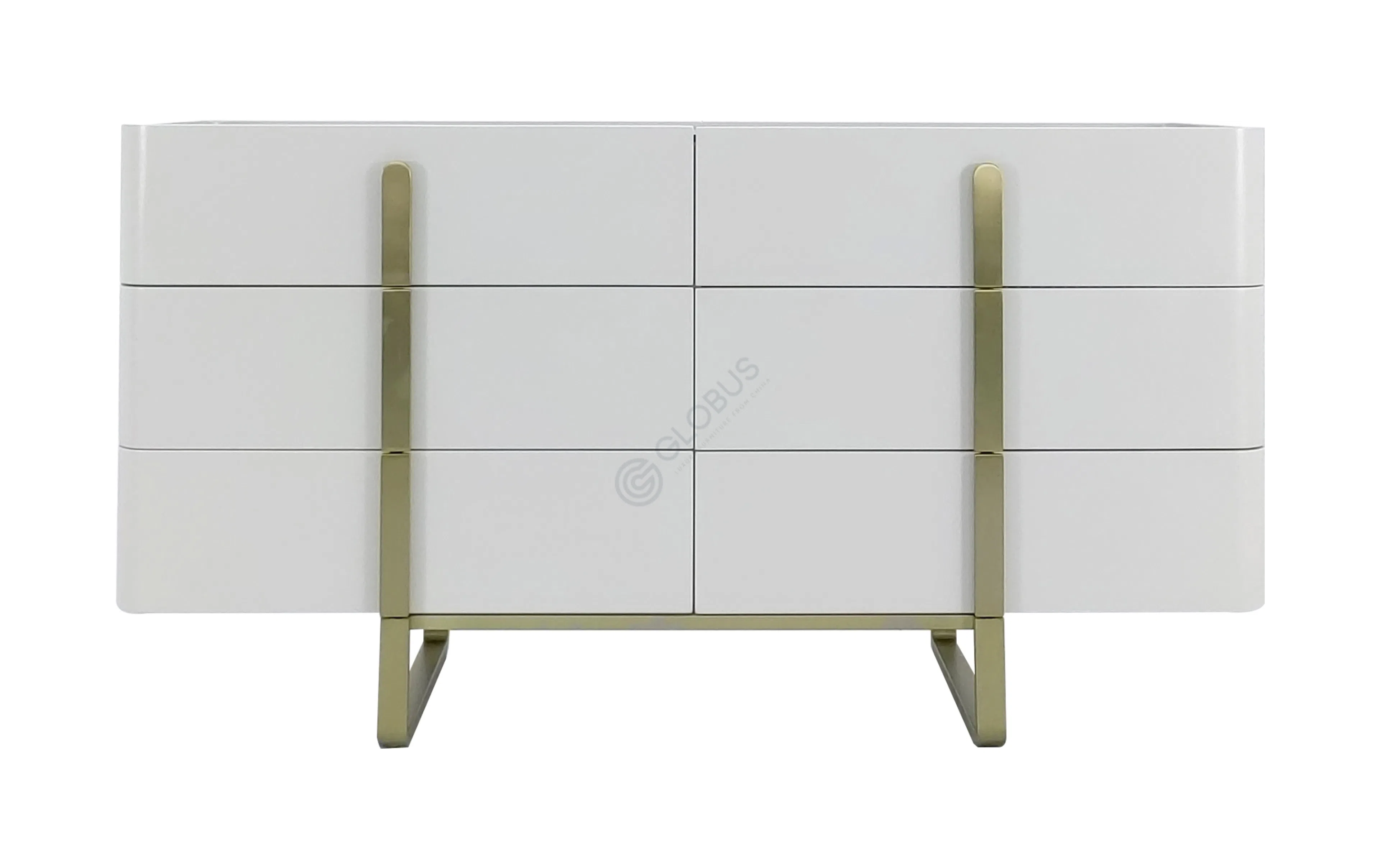 Современный комод со скругленными гранями и чистой графикой фасадов, обтянутых гладкой кожей мягкого молочного оттенка. Верхняя плоскость обрамлена натуральным деревом, что добавляет тепла и подчеркивает аккуратную линию контура.