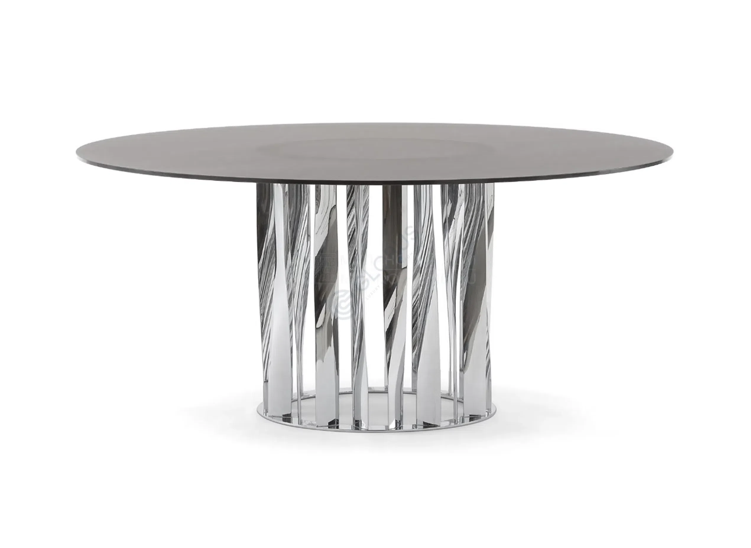 Столешница выполнена из натурального мрамора, чьи уникальные прожилки рассказывают историю времени и природы, придавая каждой поверхности неповторимый характер. Она покоится на оригинальном основании из полированной нержавеющей стали. Изящные изгибы металлической опоры создают динамичный и одновременно элегантный силуэт, напоминая современную скульптуру.