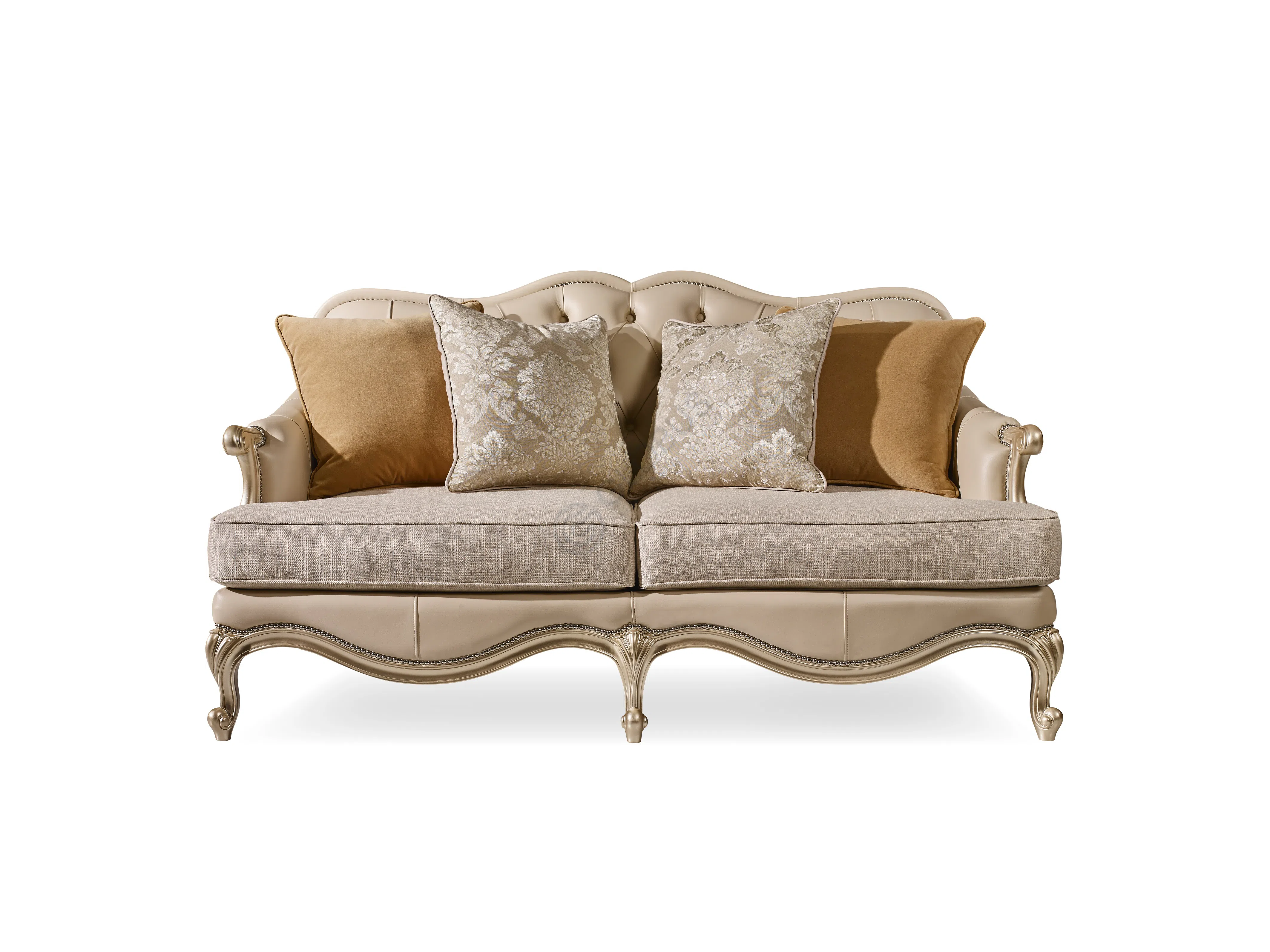 Каркас модели изготовлен из натурального дерева, его линии плавные и гармоничные. Изысканное покрытие серебристого оттенка подчеркивает резные элементы на ножках и подлокотниках, придавая предмету особый благородный вид.