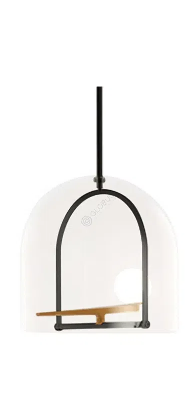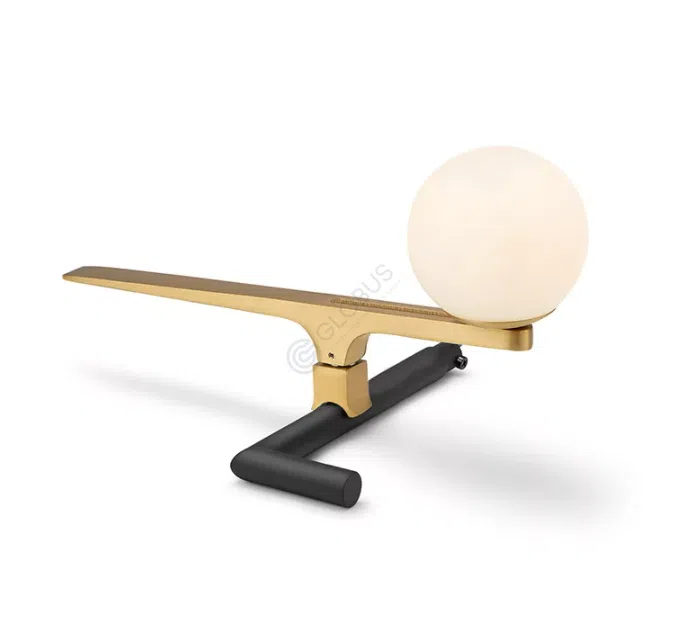 Его минималистичная основа в виде тонкого стержня и устойчивого диска поддерживает оригинальную верхнюю конструкцию. Асимметричная планка венчает этот предмет, на которой изящно расположились два источника света в виде стилизованных птиц, бережно держащих стеклянные сферы.