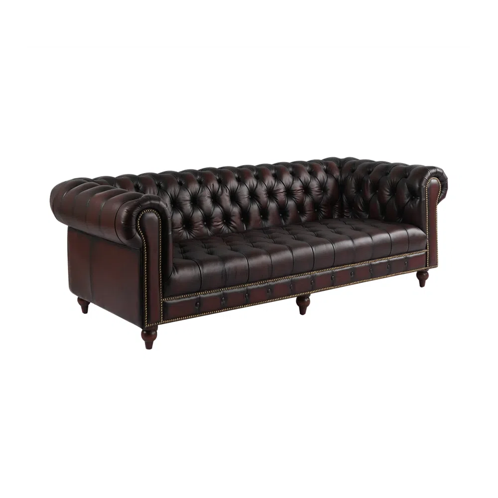 Декоративные элементы, выполненные вручную — каретная стяжка и латунные гвозди — придают изделию характер и узнаваемость классических интерьеров. Основу модели составляет прочный каркас из натурального дерева, который дополняется изящно точёными ножками.