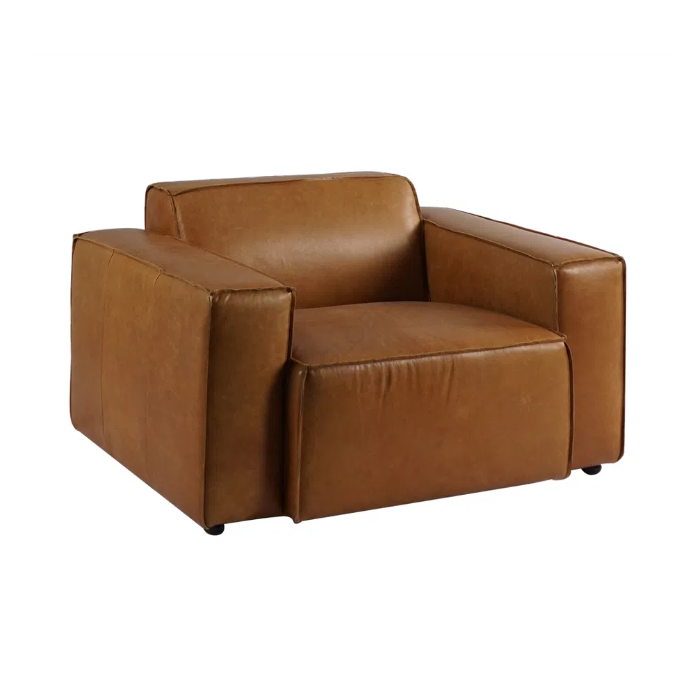Минималистичная геометрия формы органично вписывается в современный интерьер, а глубокий оттенок кожи добавляет тепла и уюта. Прямые линии и объемные подлокотники делают модель гармоничной частью гостиной в стиле лофт, где важны честные фактуры и актуальный дизайн.