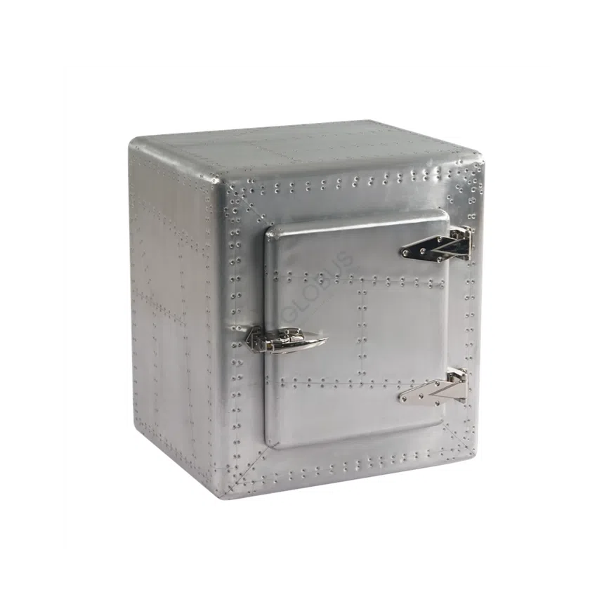 Каждая деталь этой тумбы свидетельствует о тщательности исполнения. Отполированный алюминий обит вручную, образуя поверхность, усыпанную выразительными заклепками, которые напоминают элементы старинных авиационных фюзеляжей или роскошных багажных сундуков. Массивные петли и элегантные защелки дополняют дизайн, обеспечивая надежность и удобство использования боковых отделений. Центральная открытая секция идеально подходит для размещения медиаустройств, поддерживая чистоту линий и функциональность.