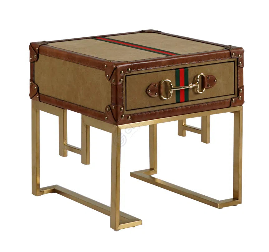 Корпус изделия обит плотным текстилем приглушенного оттенка, создавая ощущение надежности и долговечности. Акценты из натуральной кожи, выраженные в декоративных ремнях и окантовке, подчеркивают его премиальное происхождение. Фурнитура из металла, включая угловые накладки и заклепки, не только дополняет визуальный образ, но и усиливает ассоциации с роскошным дорожным багажом прошлых эпох. Основание, выполненное из прочного железа, придает конструкции устойчивость и завершает индустриальный образ.