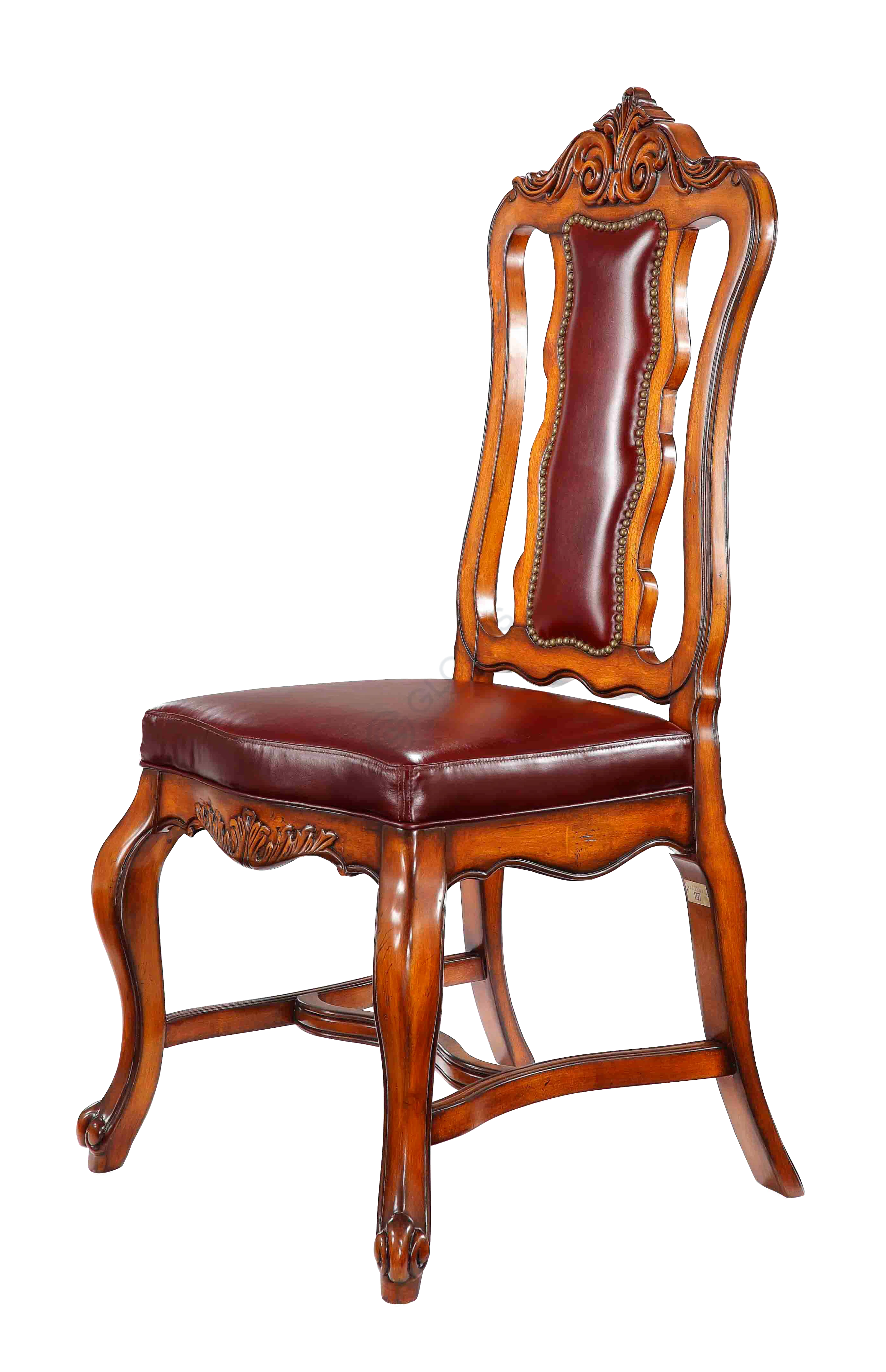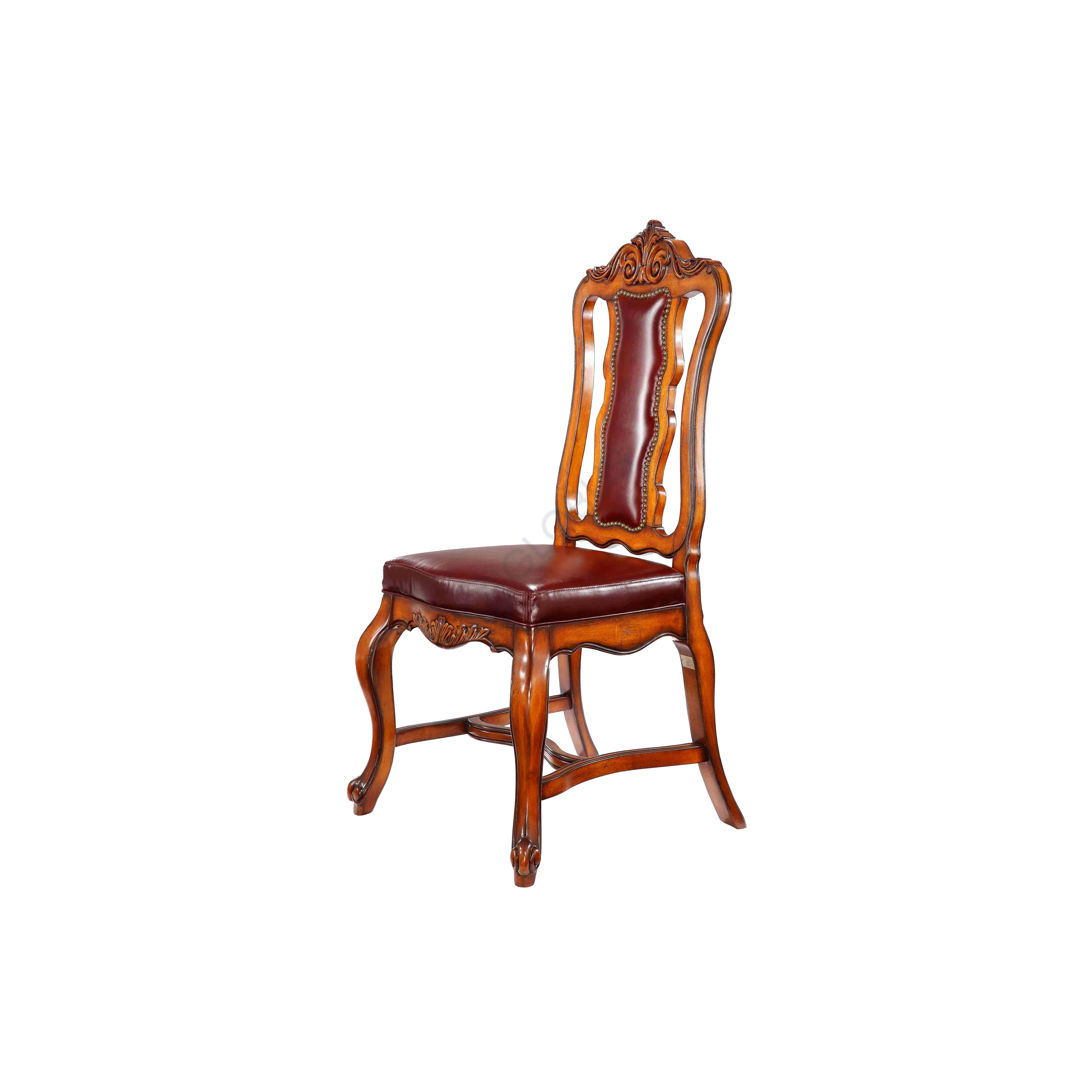 Каркас стула изготовлен из натурального дерева с глубоким, насыщенным оттенком, что подчеркивает его прочность и благородный вид. Сиденье и спинка обиты высококачественной кожей винного цвета, обеспечивая непревзойденный комфорт и долговечность. Такое сочетание природных материалов создает ощущение роскоши и уюта.