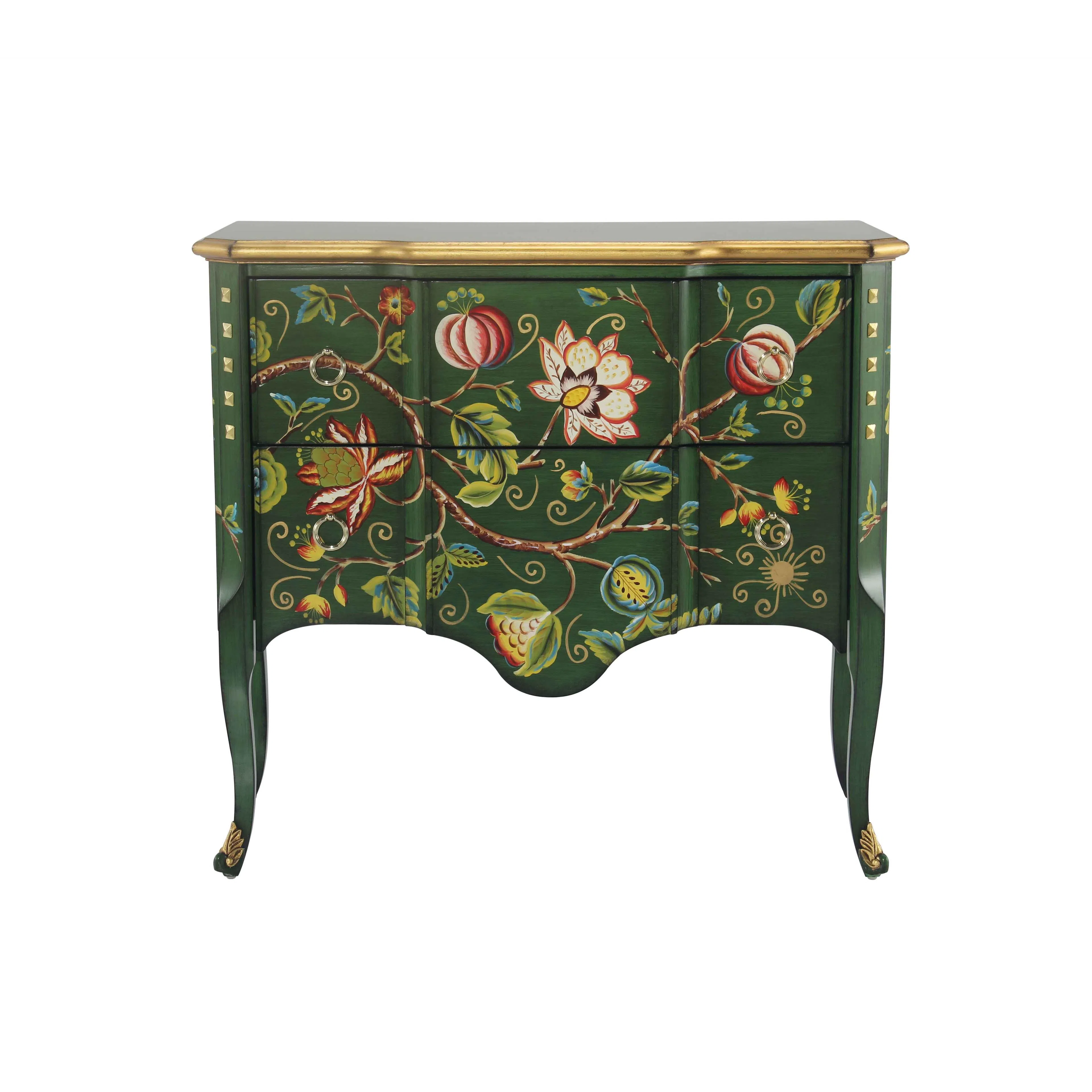 Поверхность фасада украшена живописным декором. Искусная роспись изображает птиц и цветочные мотивы, добавляя изделию уникальности и художественной ценности. При создании этого предмета использованы качественные материалы: прочный МДФ для основы и массив дерева для верхнего элемента, обеспечивая долговечность и приятные тактильные ощущения.