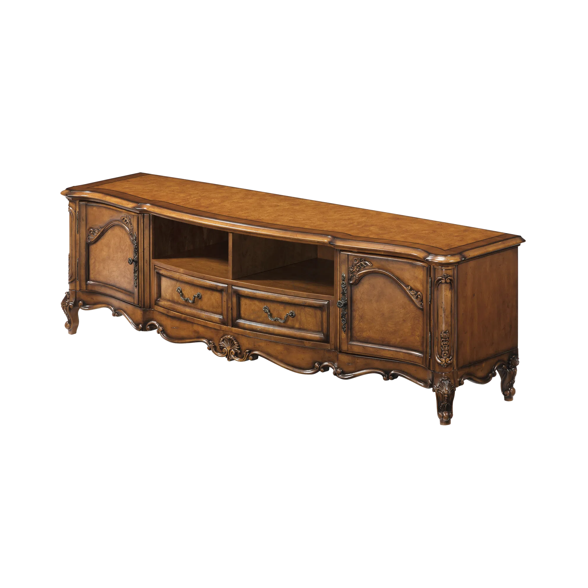 ТВ тумба в европейском классическом стиле гармонично сочетает благородство натурального дерева и изысканную работу шпона. Каждый изгиб фасада подчеркивает внимание к деталям, а плавные линии придают облику легкость и элегантность.
