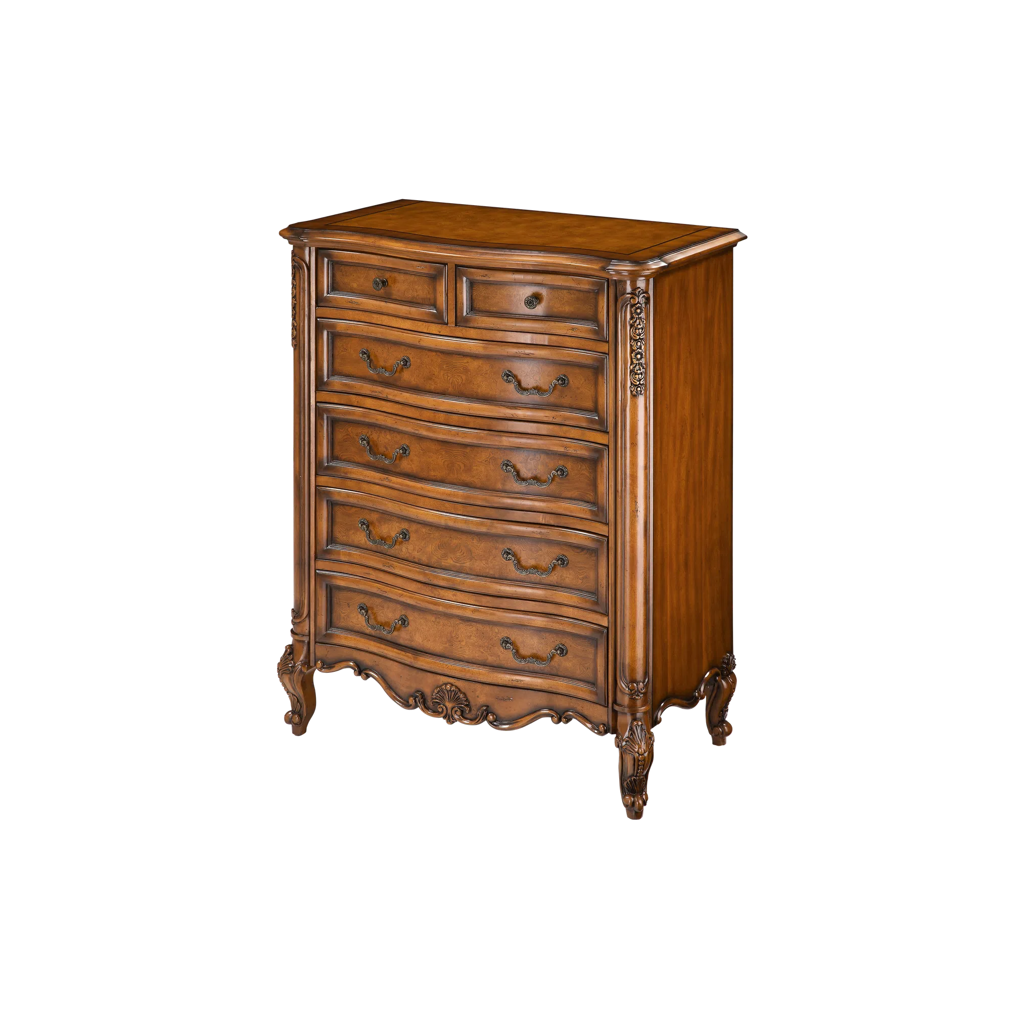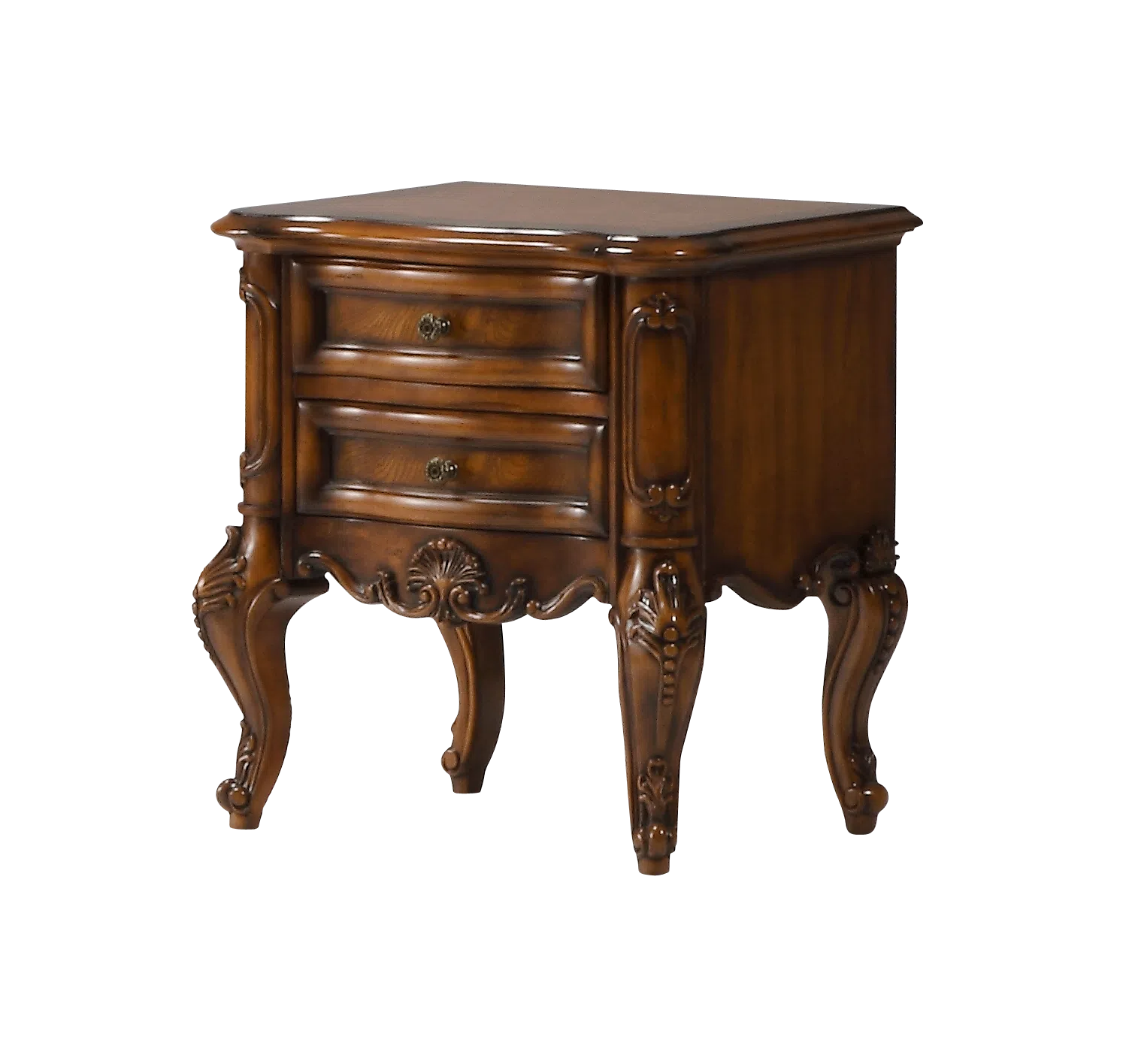 Мягко изогнутые ножки изделия, украшенные филигранными резными деталями, образуют основу, на которую опирается ровная, прочная верхняя панель. Два просторных выдвижных ящика, оснащённых изящными металлическими ручками, предоставляют достаточно места для ваших вещей, создавая функциональность без ущерба для элегантности.