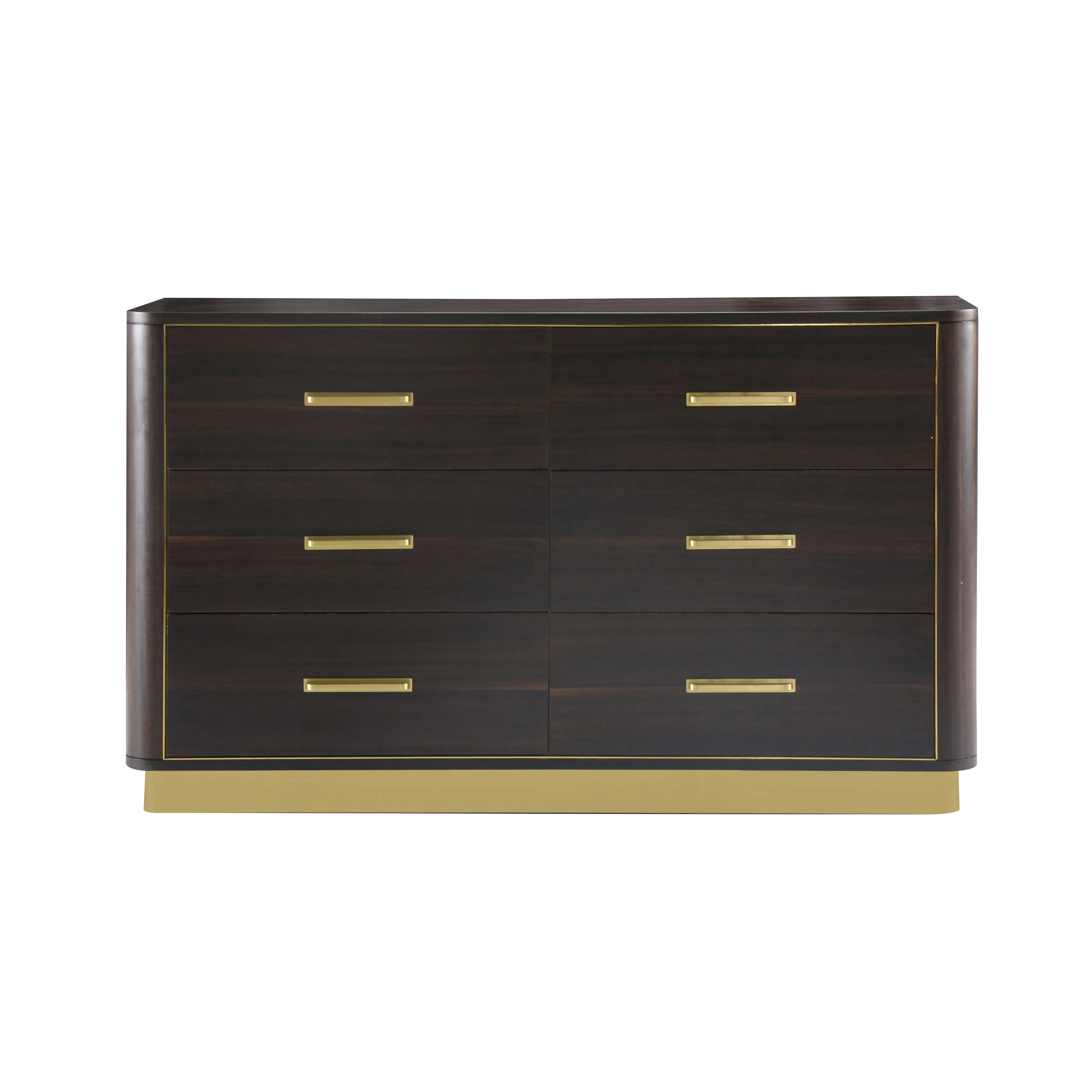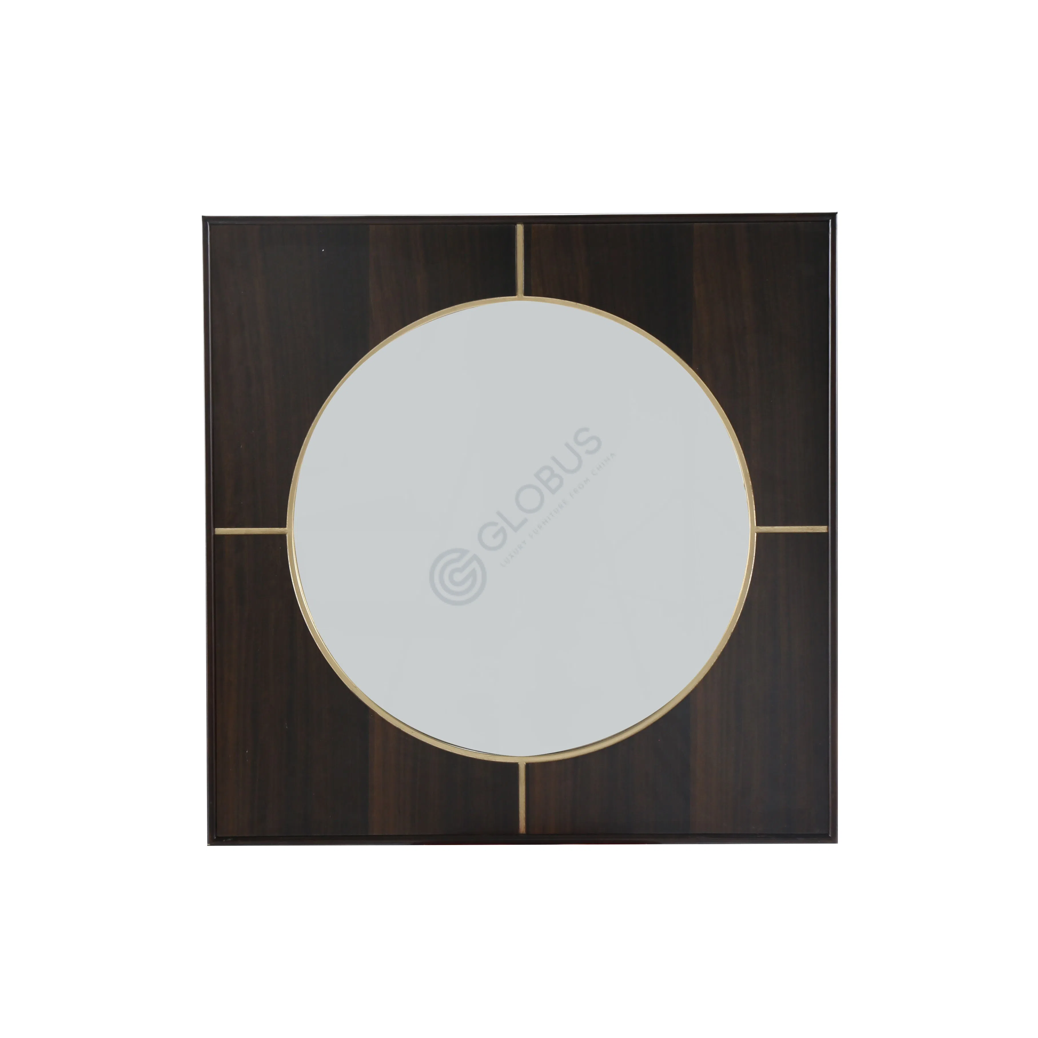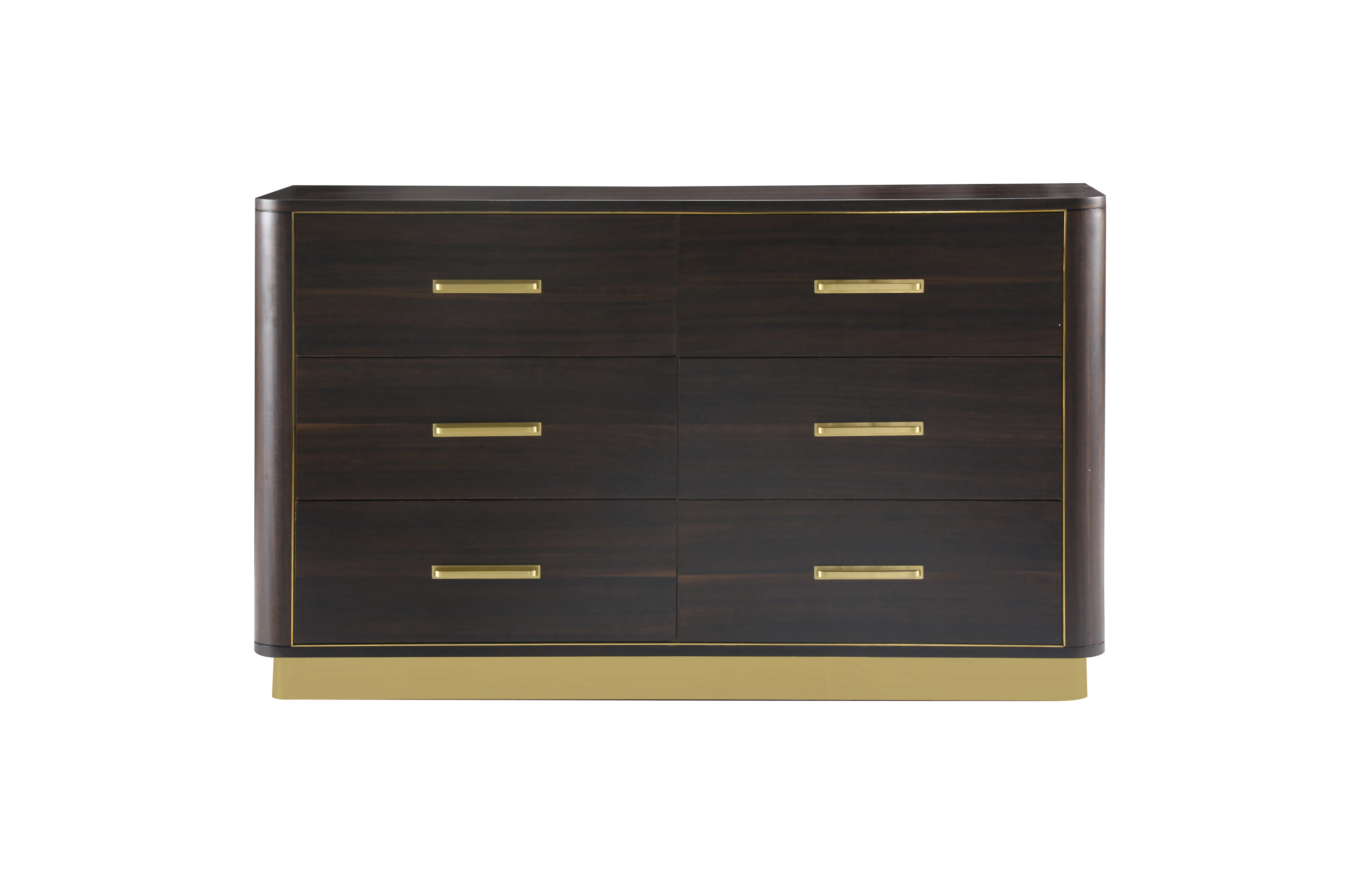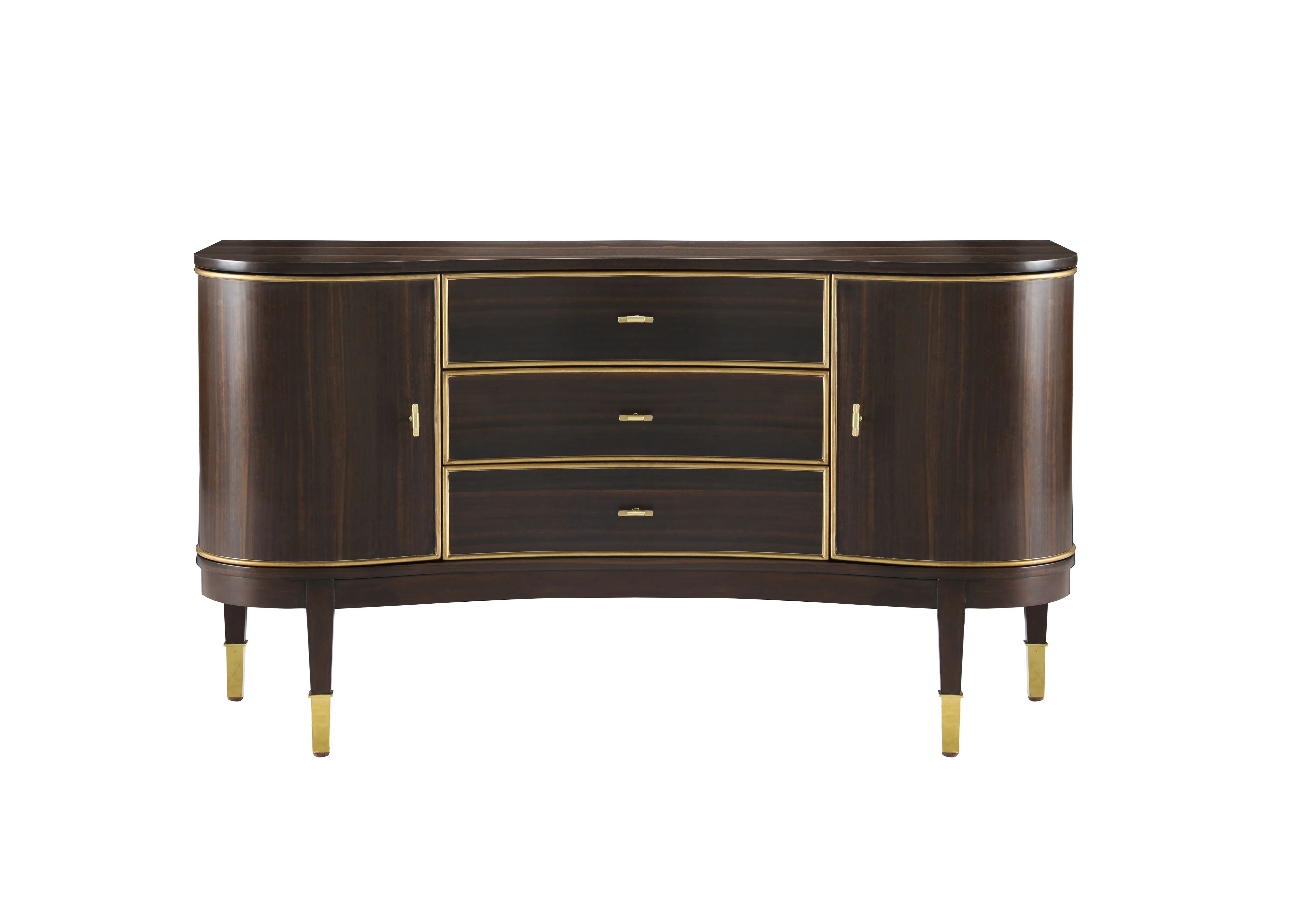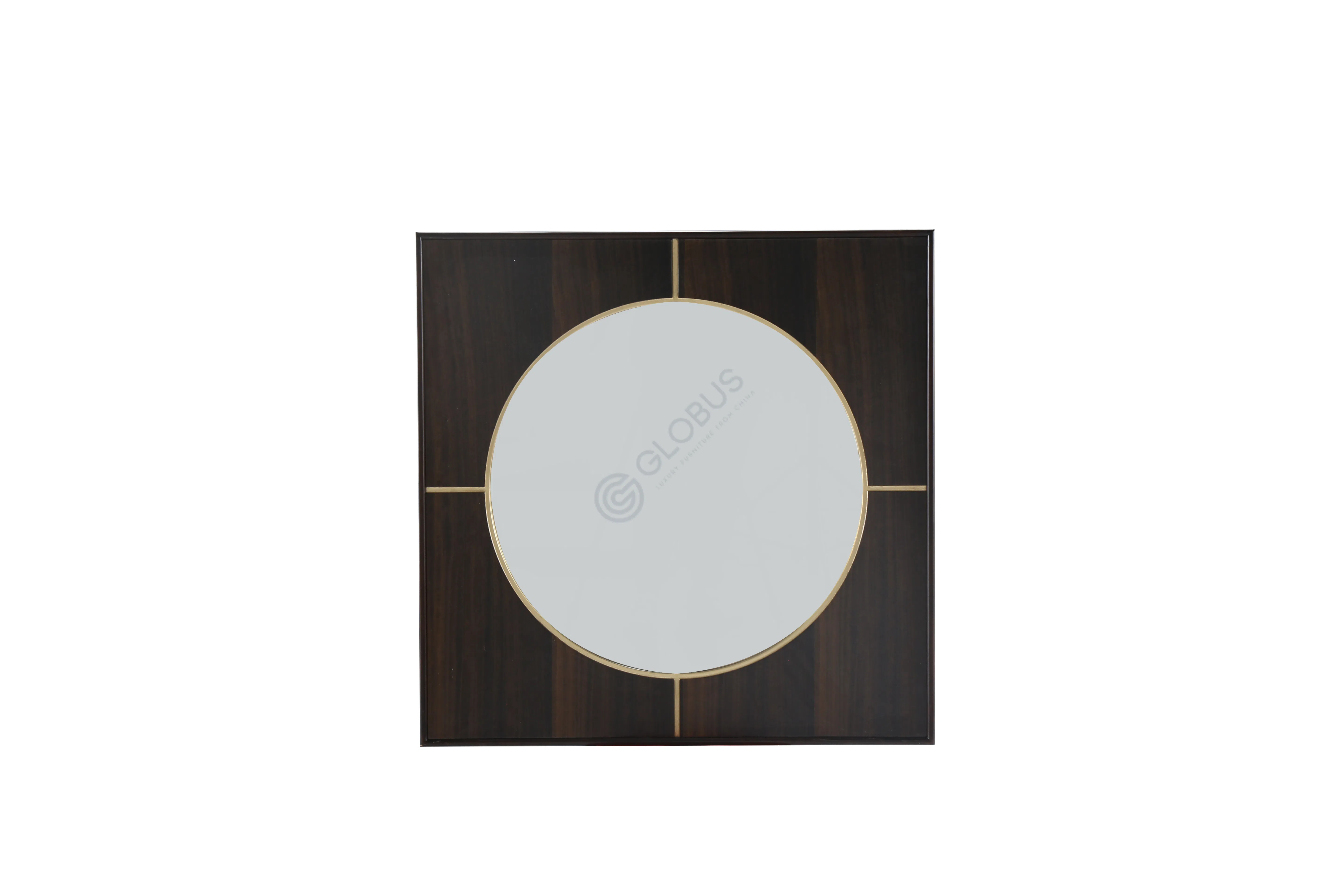 Корпус изделия выполнен с применением натурального дерева и МДФ, покрыт шпоном ценных пород, демонстрируя глубокий темный оттенок и изящные округлые формы. Завершает образ металлическое основание в отделке под золото, придающее особый акцент и легкое сияние.