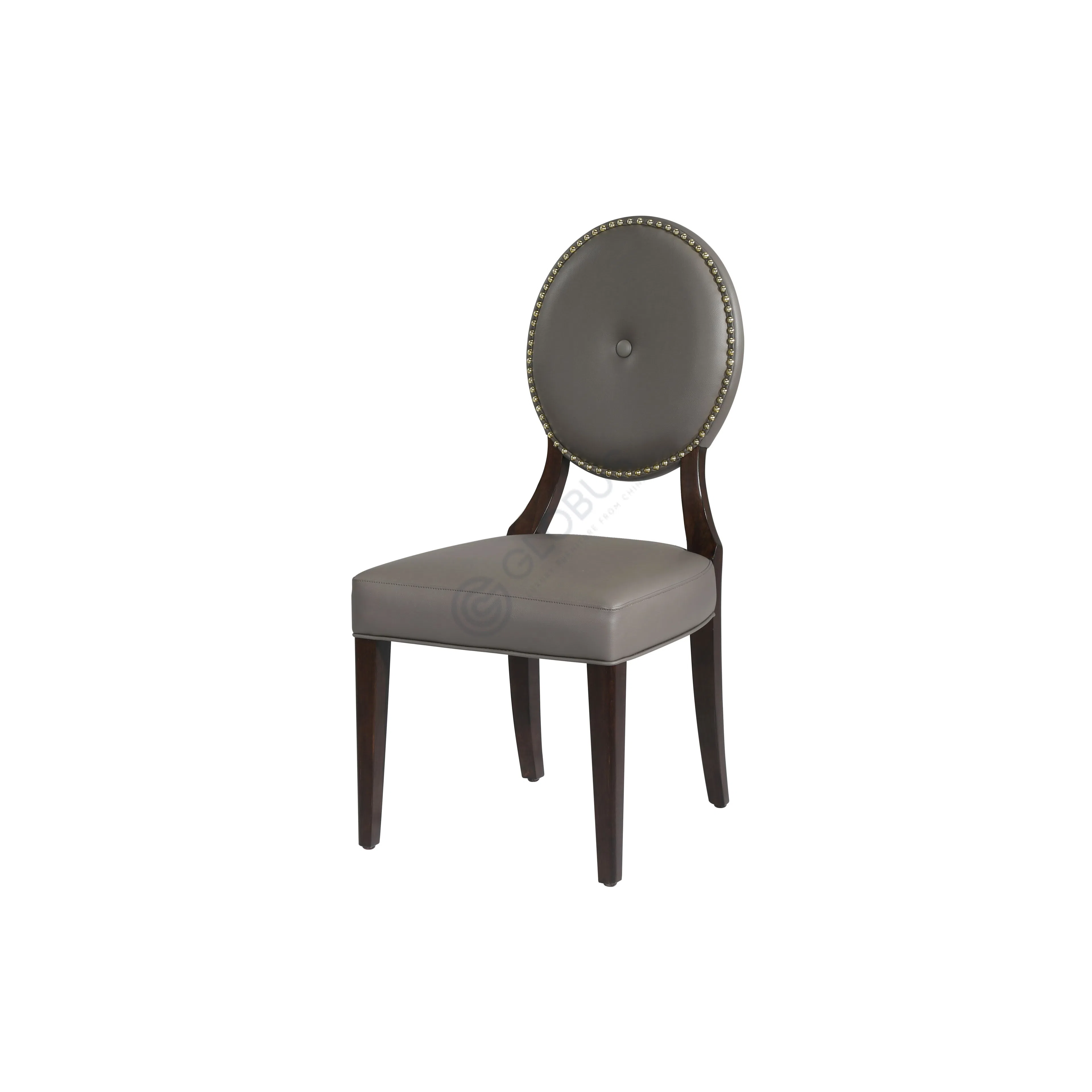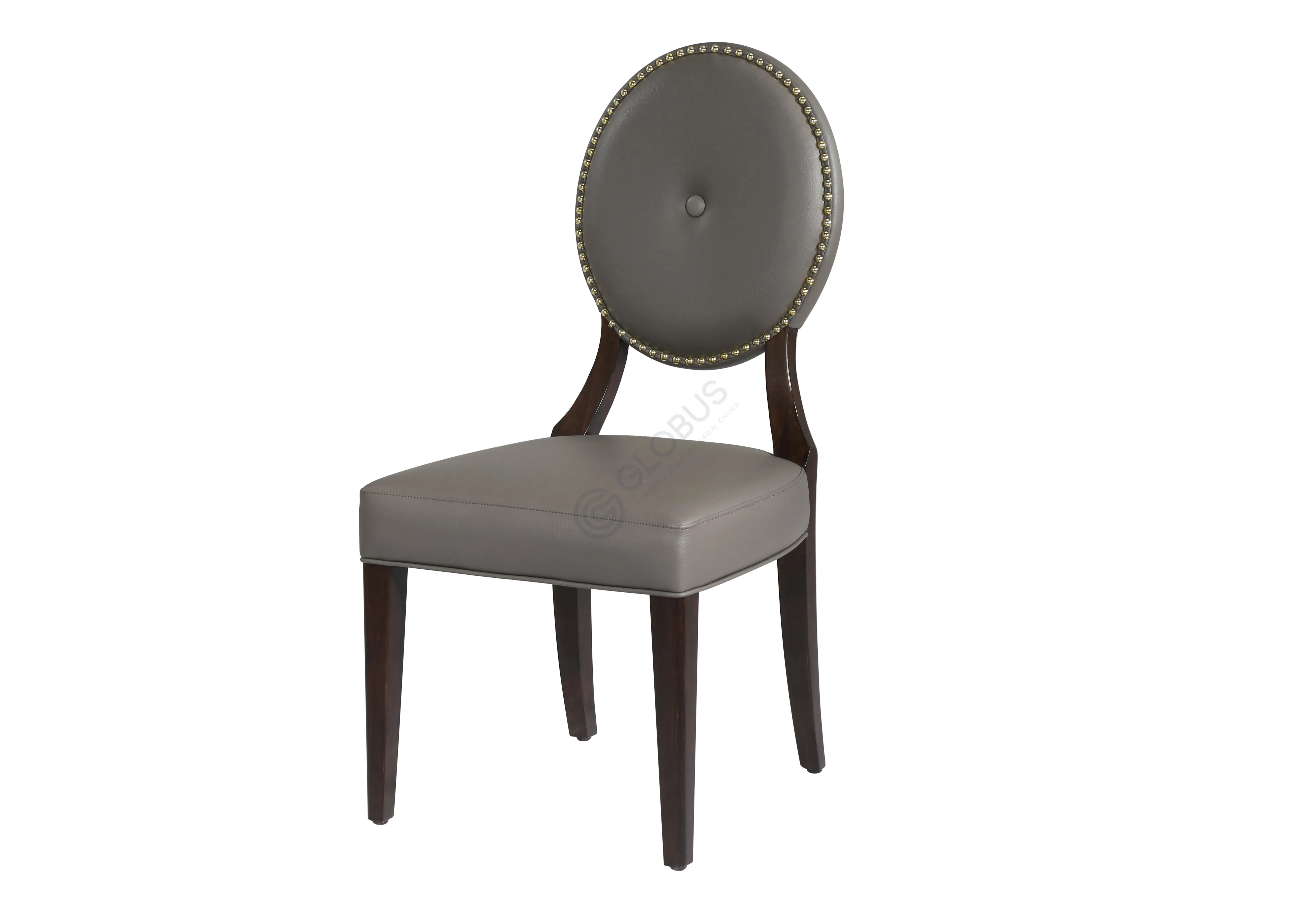 Каркас стула изготовлен из натурального дерева и МДФ, обеспечивая прочность и надежность конструкции. Сиденье и спинка, выполненная в оригинальной округлой форме, обтянуты качественной экокожей приятного серого оттенка, которая отличается долговечностью и простотой ухода. Особый шарм придает декор в виде металлических заклепок, расположенных по периметру спинки.
