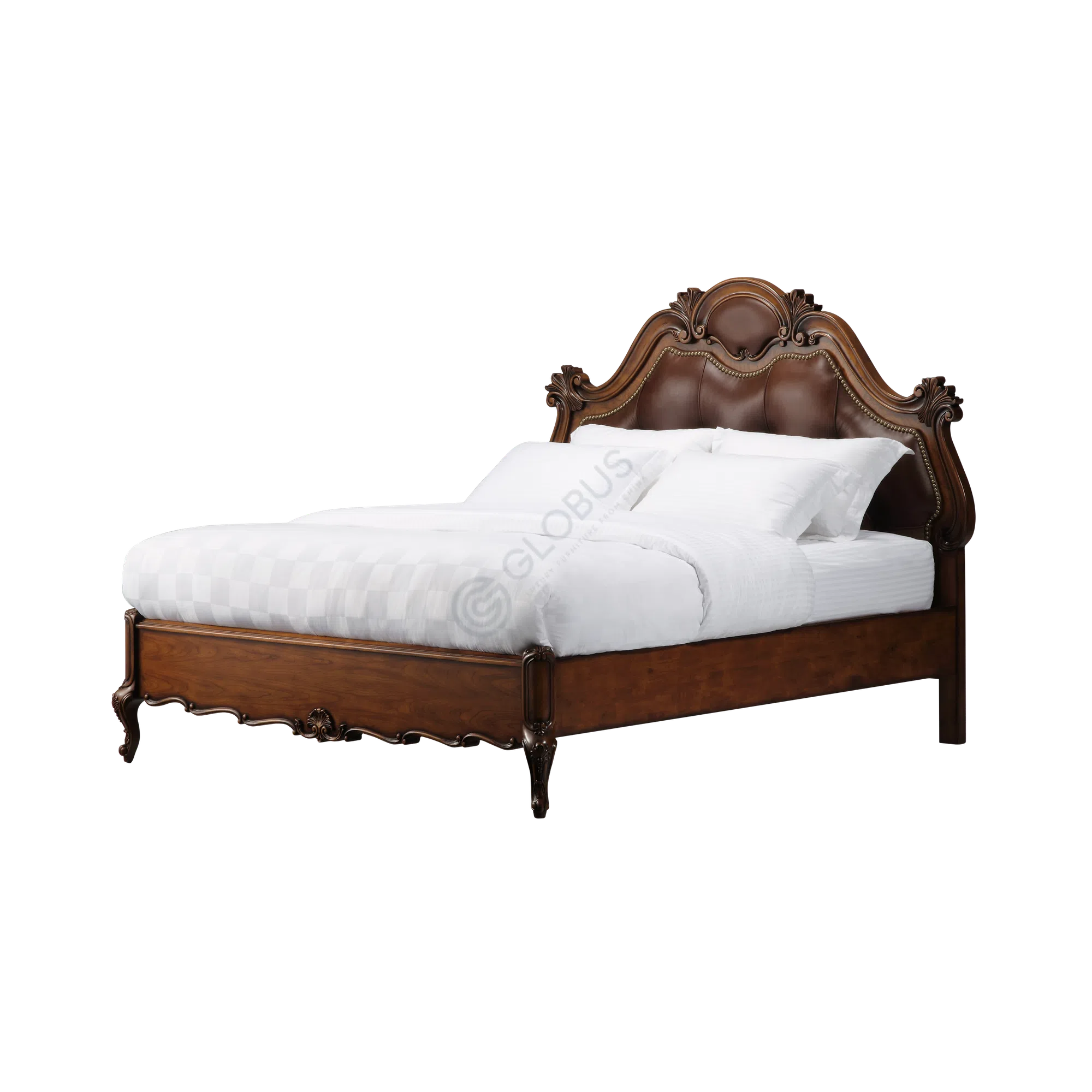 Дизайн кровати выполнен в духе европейской классики. Изысканная резьба украшает массивные детали каркаса и изголовье, добавляя изделию дворцового шарма. Изогнутые формы изголовья и декоративные элементы обивки создают ощущение величия и изящества, характерное для классического стиля.