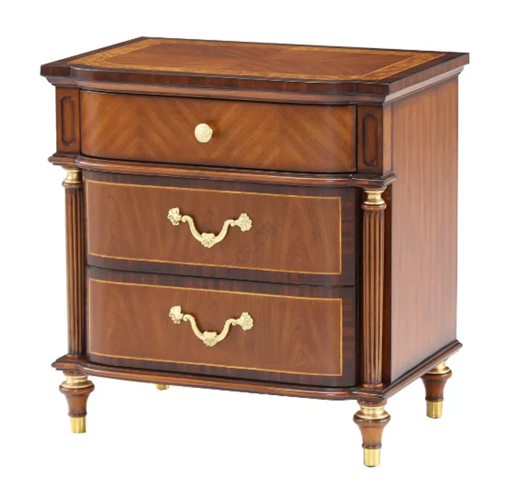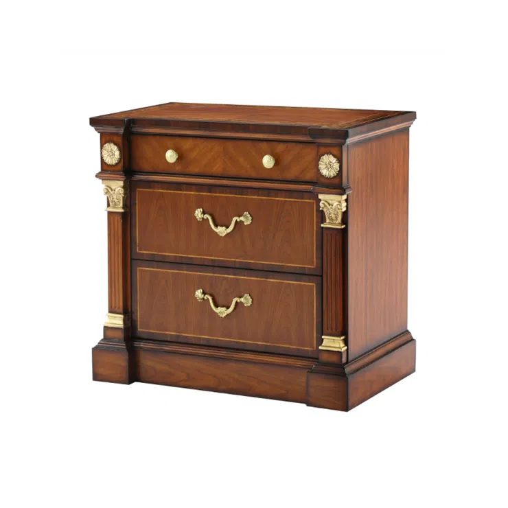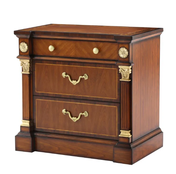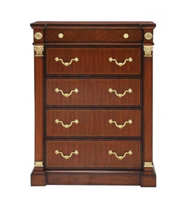 Комод в стиле европейской классики сочетает изысканную архитектуру с безупречной отделкой. Корпус и фасады выполнены из натурального дерева и тщательно подобранного шпона, что придаёт изделию глубину природной текстуры и мягкое сияние. Декоративная патина и металлизированные элементы акцентируют на себе внимание, образуя утончённый контраст с благородным оттенком древесины.