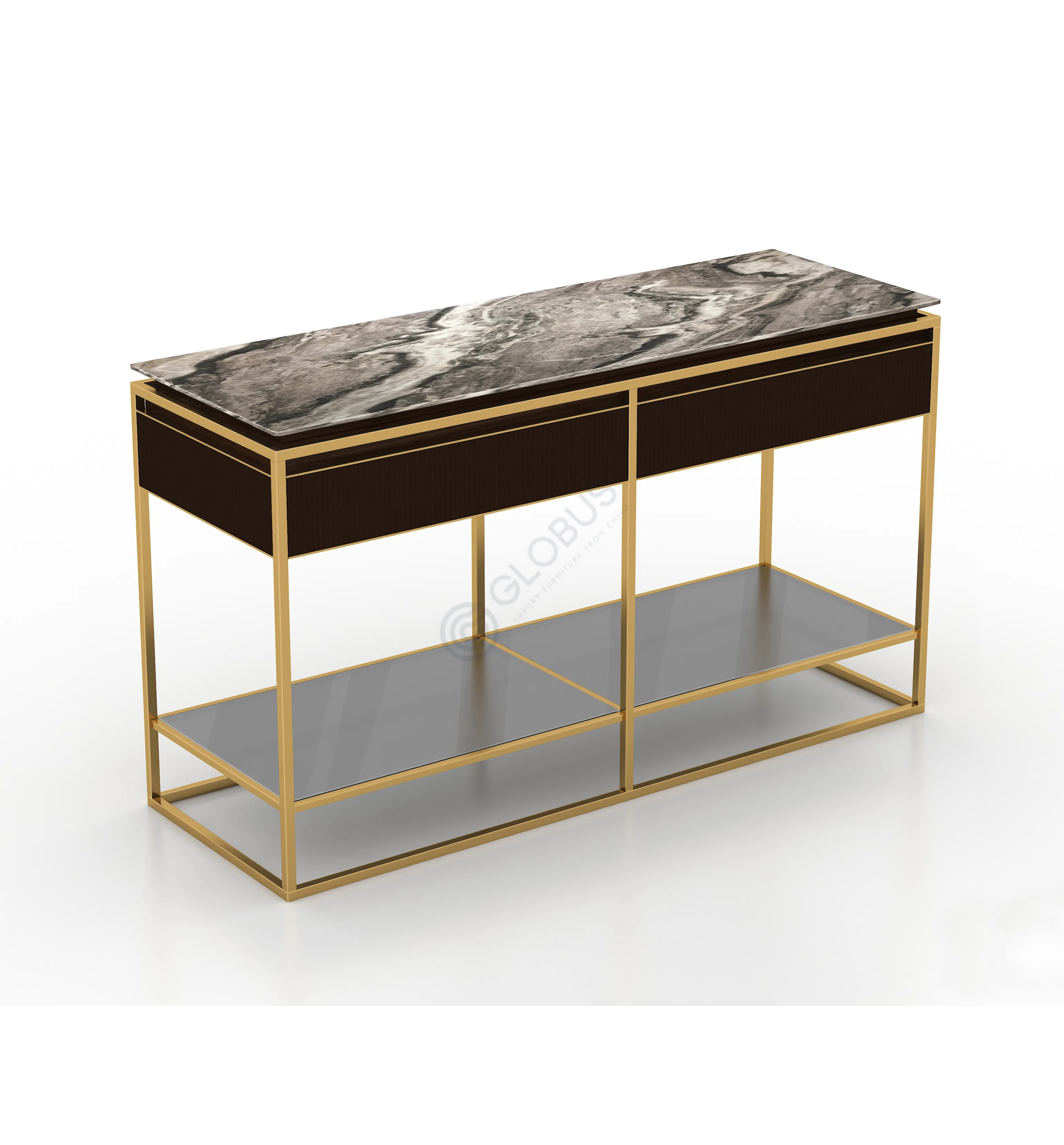 Основание столика образует изящный металлический каркас с золотистым финишем, придающий конструкции легкость и визуальную устойчивость. Боковые панели стола, отделанные шпоном поверх прочной HDF плиты, дополнены вертикальной фрезеровкой, которая добавляет текстурную глубину и создает интересный контраст с гладкой поверхностью мрамора и металла.