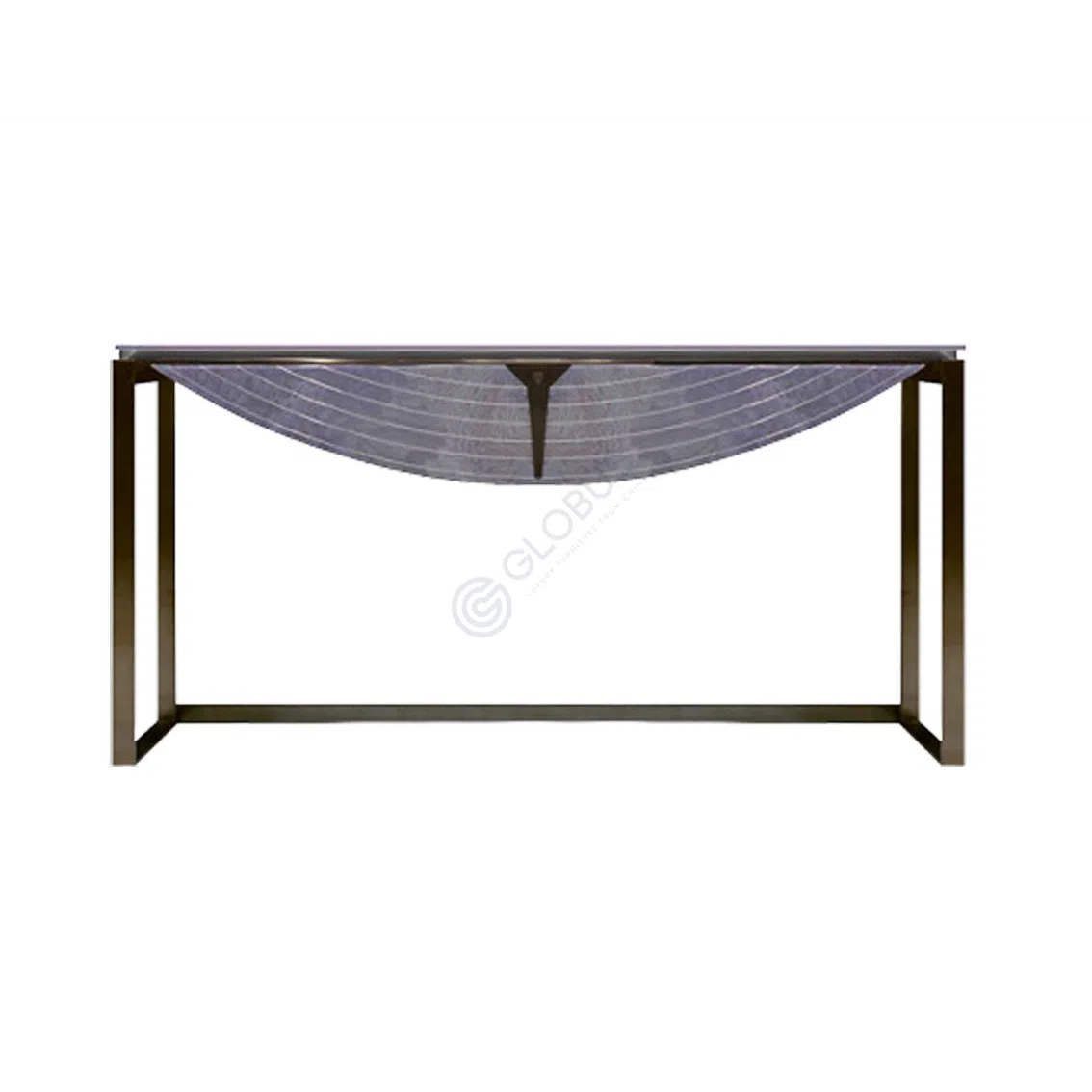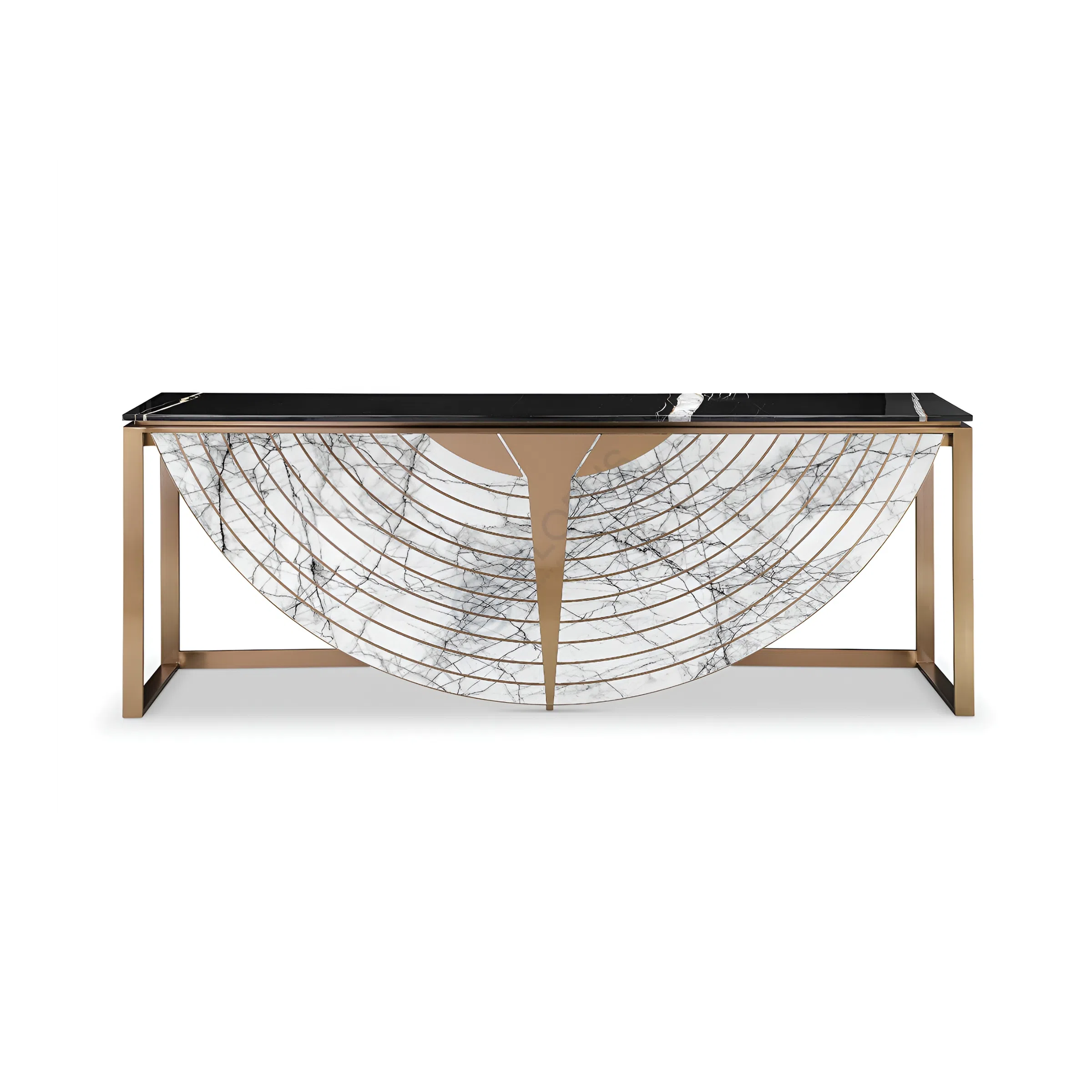Прямоугольная столешница, выполненная из натурального мрамора с характерным природным рисунком, контрастирует с изогнутыми формами основания. Часть поверхности отделана темным шпоном или деревом, добавляя глубину и теплоту композиции. Тонкие металлические опоры придают силуэту воздушность, обеспечивая при этом прочную и надежную основу.