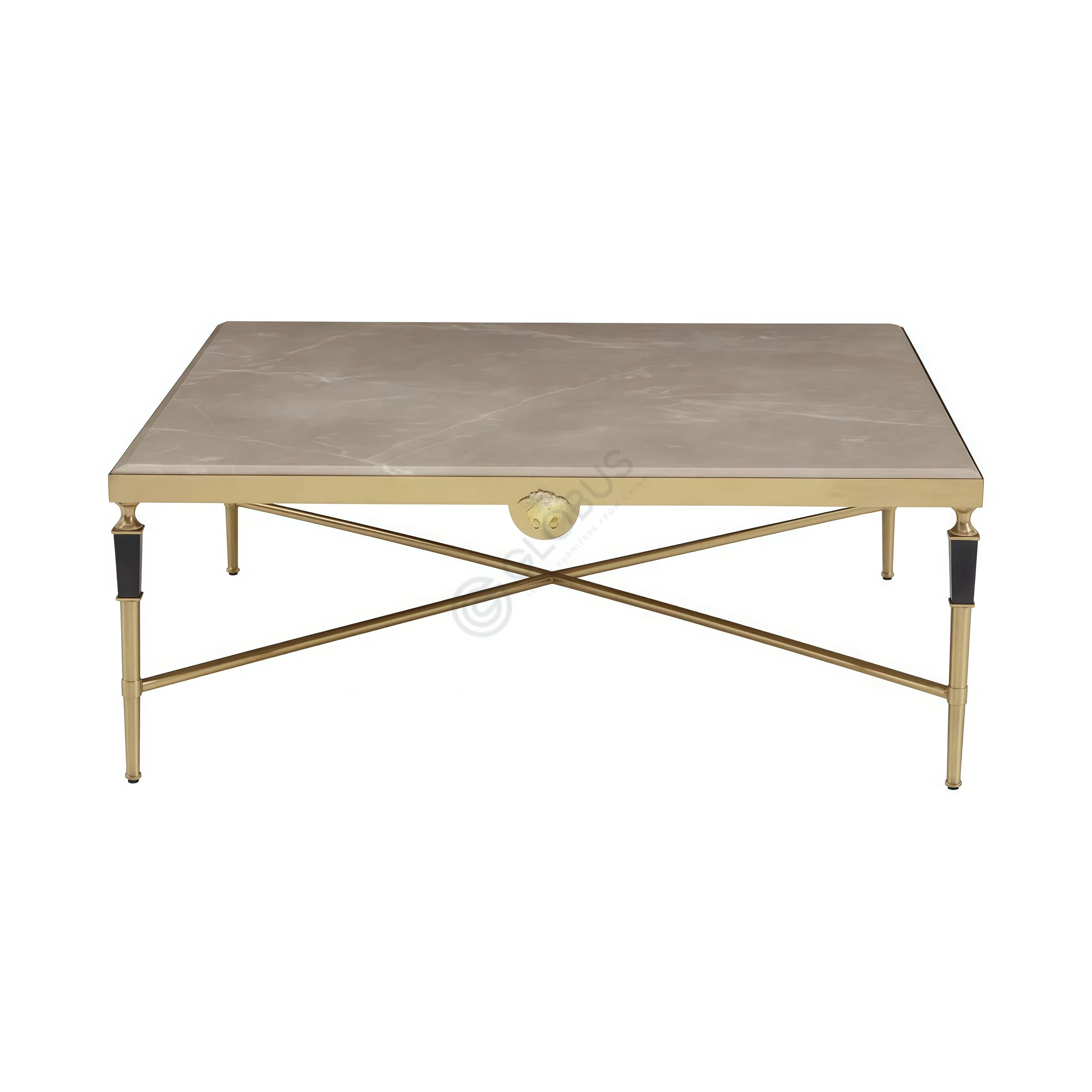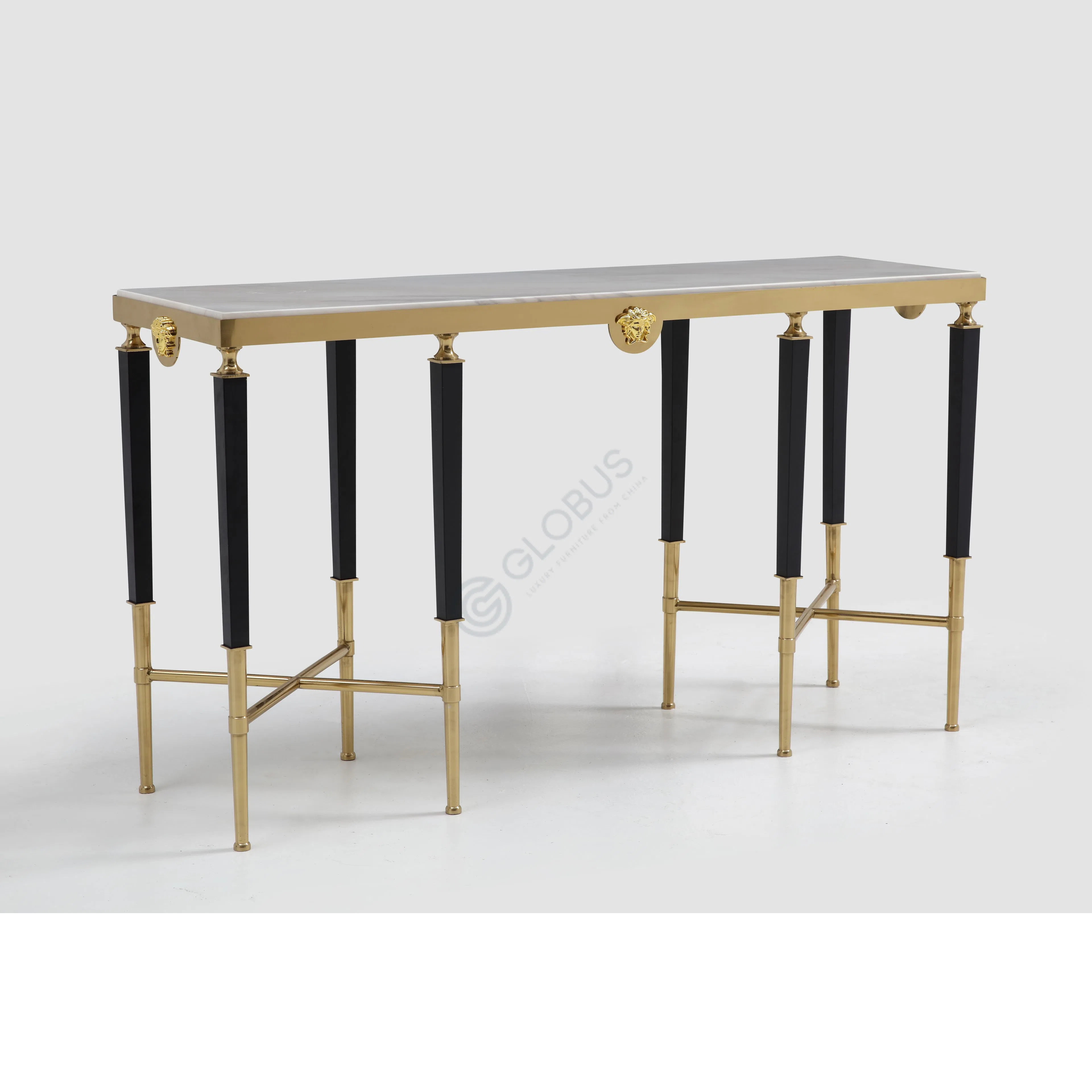 Верхняя панель выполнена из натурального мрамора, чья уникальная прожилковая текстура придает поверхности особую глубину и благородство. Она обрамлена тонким кантом из полированной нержавеющей стали, который эффектно подчеркивает сияние камня и добавляет современный шик. Фасады и корпус, созданные на основе фанеры, облицованы высококачественным шпоном глубокого темного оттенка, что формирует впечатление престижа и приятной на ощупь текстуры. В центральной части фасада размещен выразительный декоративный медальон, служащий изысканной деталью.