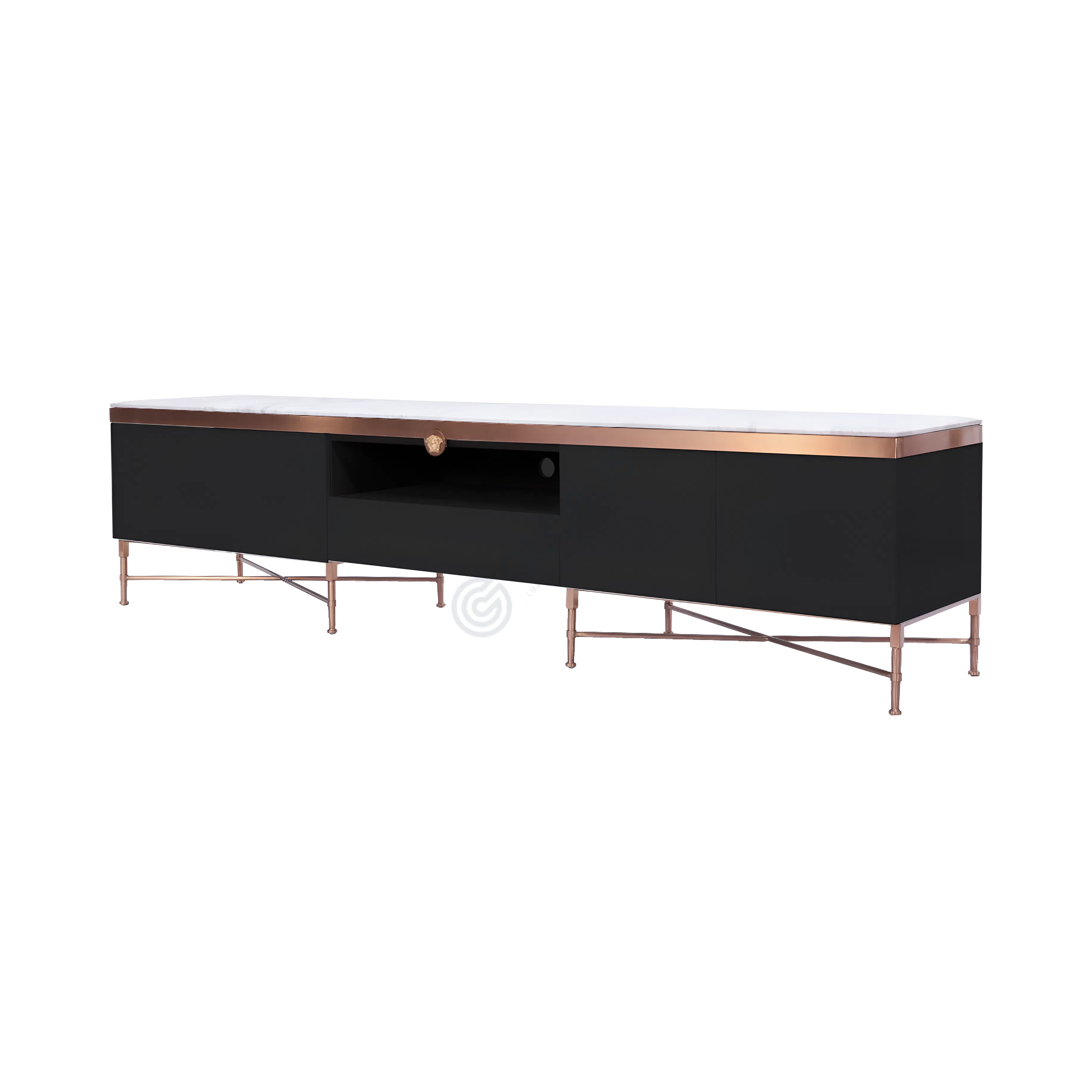 Конструкция изделия опирается на утонченные, но чрезвычайно прочные опоры из нержавеющей стали. Каждая пара ножек соединена элегантной перекладиной в виде креста, что придает всему ансамблю визуальную легкость и обеспечивает превосходную устойчивость. Функциональность данного буфета позволяет успешно использовать его для хранения в гостиной, столовой или даже на просторной кухне, гармонично вписываясь в различные концепции интерьера.