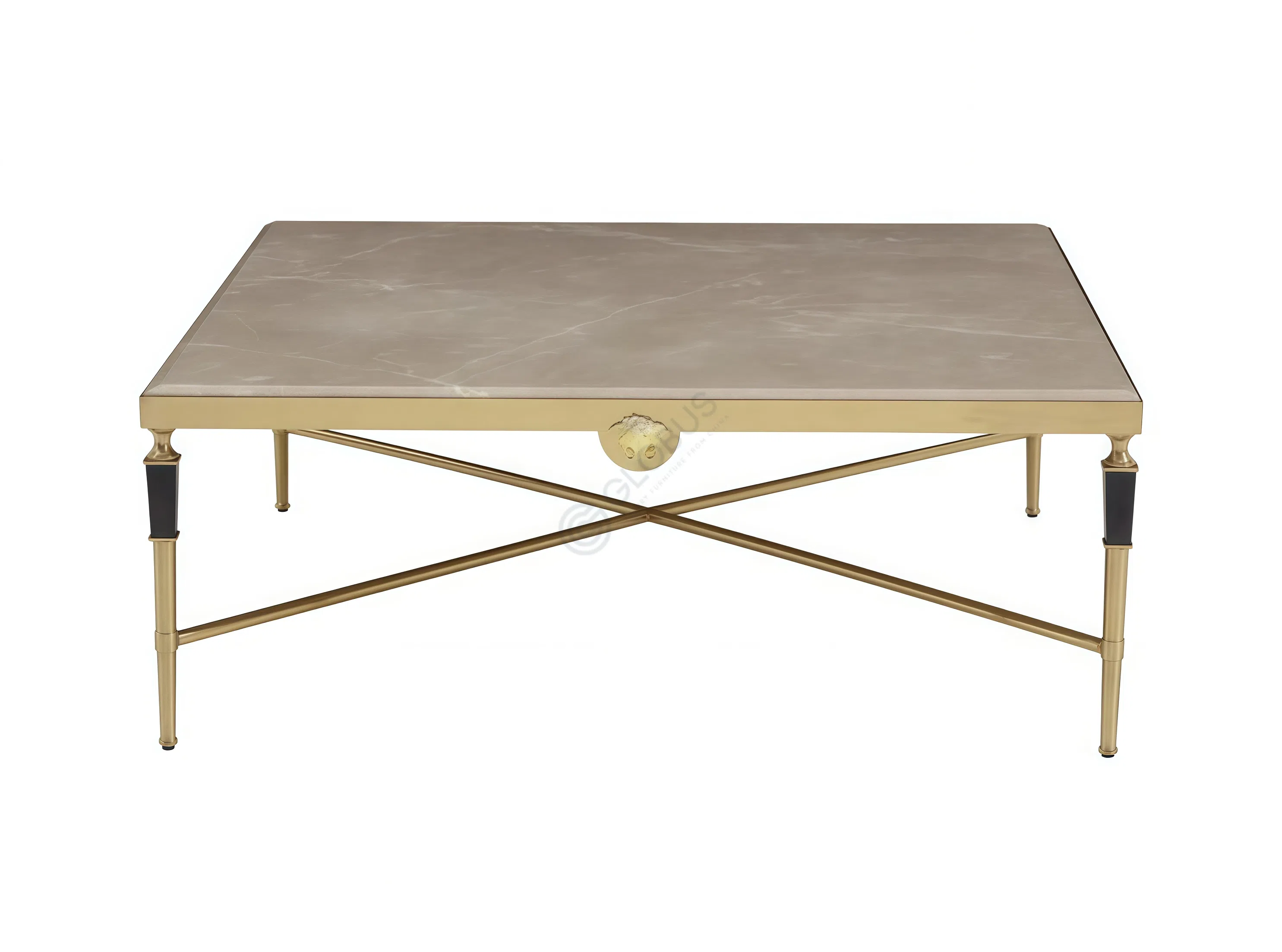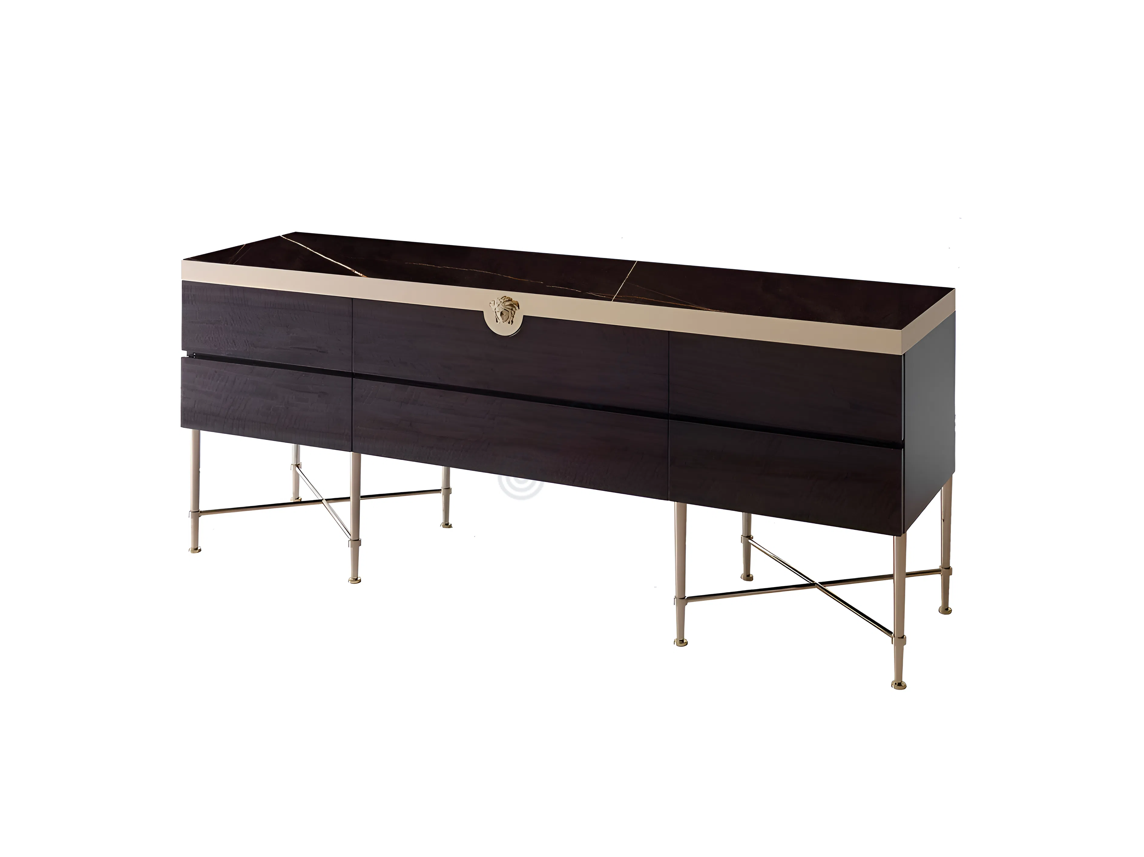 Основание тумбы представляет собой легкую, но прочную конструкцию из нержавеющей стали в розово-золотистом оттенке, которая придает всей композиции воздушность и дополнительный шик. Функциональное решение включает просторные закрытые отсеки по бокам и удобную открытую нишу по центру, предназначенную для медиаустройств. Особенностью является центральный декоративный элемент — изысканный медальон с рельефным изображением, который служит визитной карточкой утонченного вкуса.