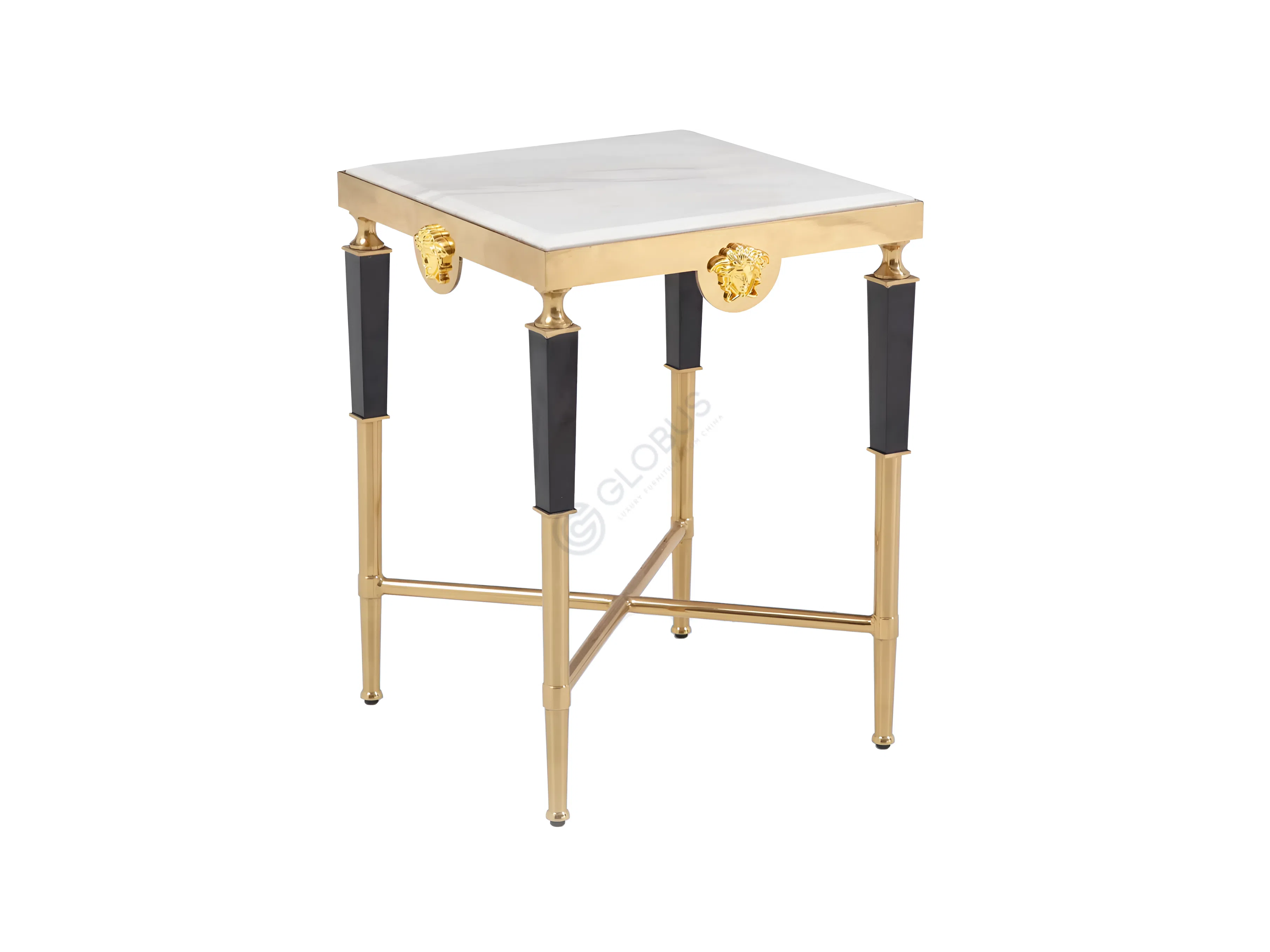 Верхняя панель выполнена из искусственного мрамора, демонстрируя нежные светлые прожилки, которые добавляют предмету изящества. Этот светлый элемент эффектно контрастирует с глубоким матовым покрытием основного корпуса, созданного из прочной фанеры. Металлический кант из нержавеющей стали с благородным медным отливом очерчивает столешницу, подчеркивая ее совершенство.