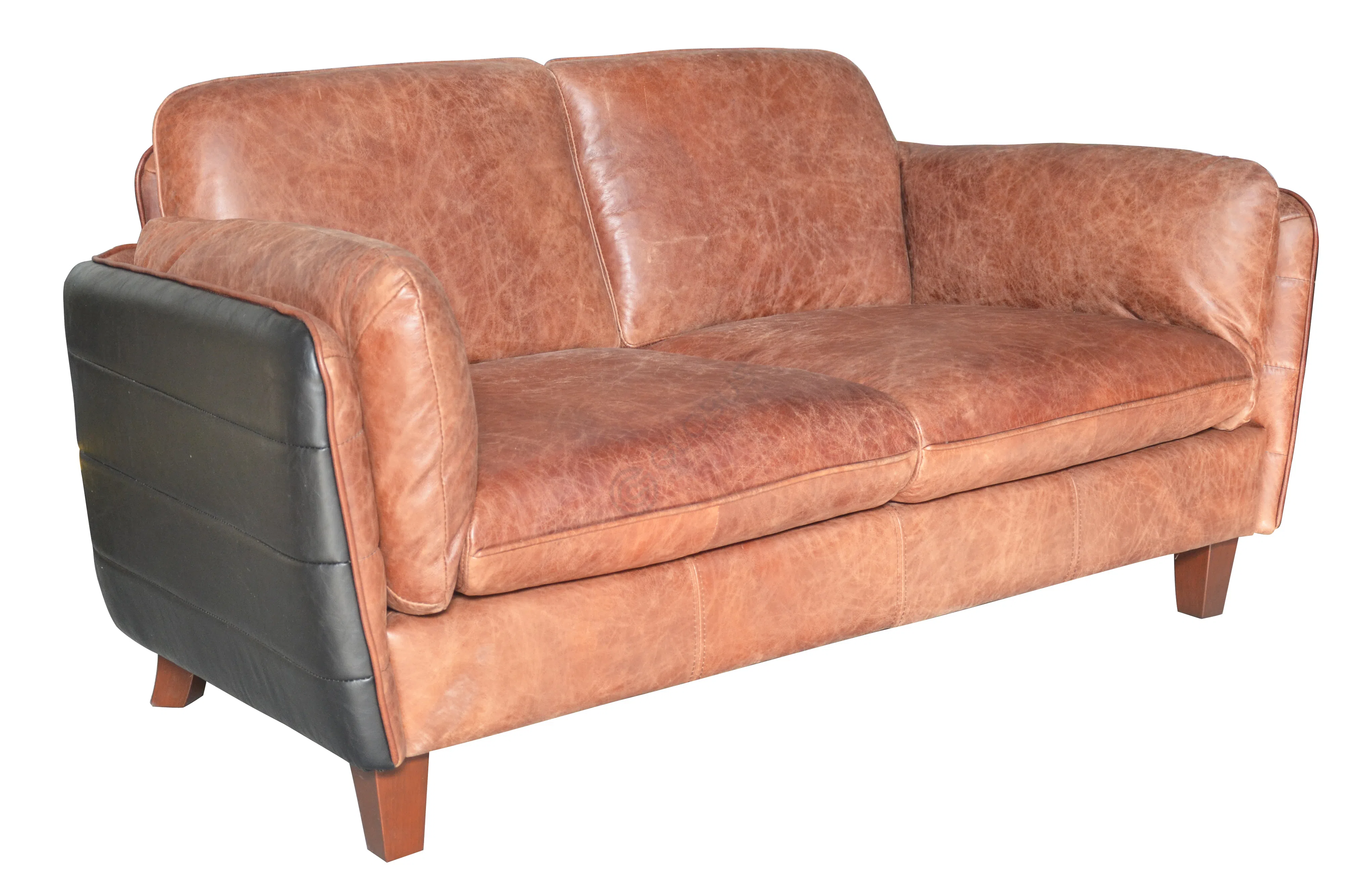 Каркас предмета мебели искусно выполнен из комбинации прочной фанеры и натурального дерева, гарантируя долговечность конструкции. Сиденье и спинка обиты высококачественной экокожей теплого, насыщенного оттенка, который имитирует благородное старение, добавляя винтажную нотку.