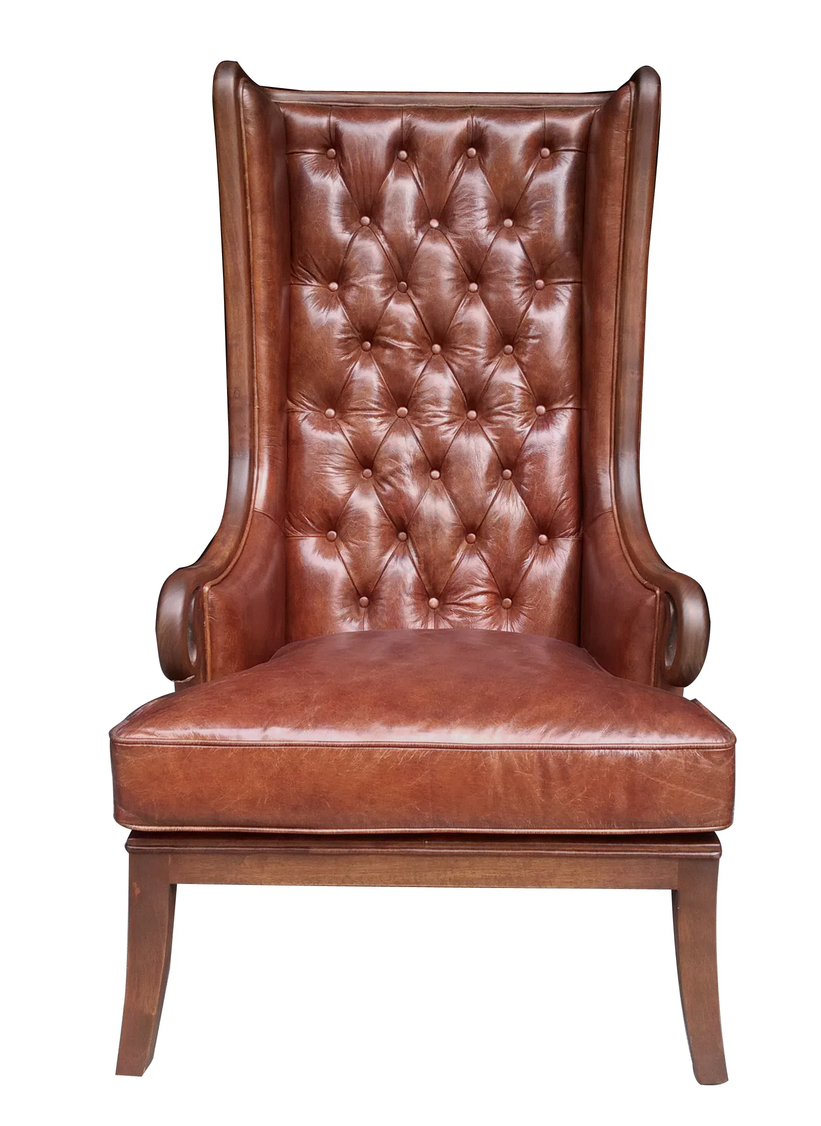 Этот предмет мебели мгновенно заявляет о себе в пространстве гостиной. Его выразительный силуэт с высокой спинкой и боковыми элементами напоминает классические формы, переосмысленные в контексте современной эстетики лофта. Глубокая стяжка на спинке придает текстуре обивки богатый объем и характерный винтажный вид.