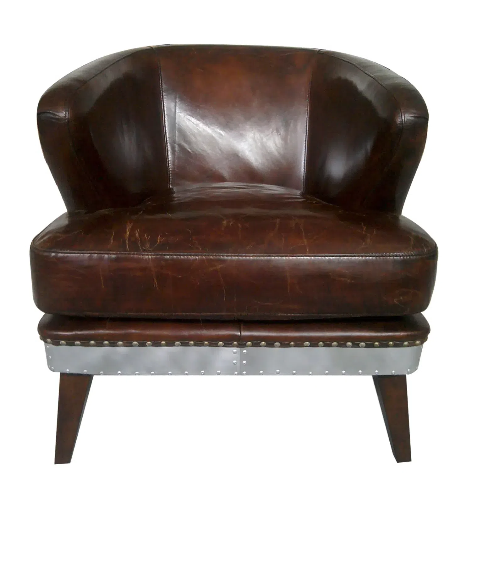 Обивка выполнена из высококачественной кожи, которая со временем приобретает благородную патину, подчеркивая уникальность каждого экземпляра. В основе конструкции – прочный каркас из натурального дерева и фанеры, обеспечивающий надежность и долговечность. Акцентные детали в виде декоративных гвоздиков по периметру сиденья добавляют винтажный шарм и подчеркивают мастерство исполнения.