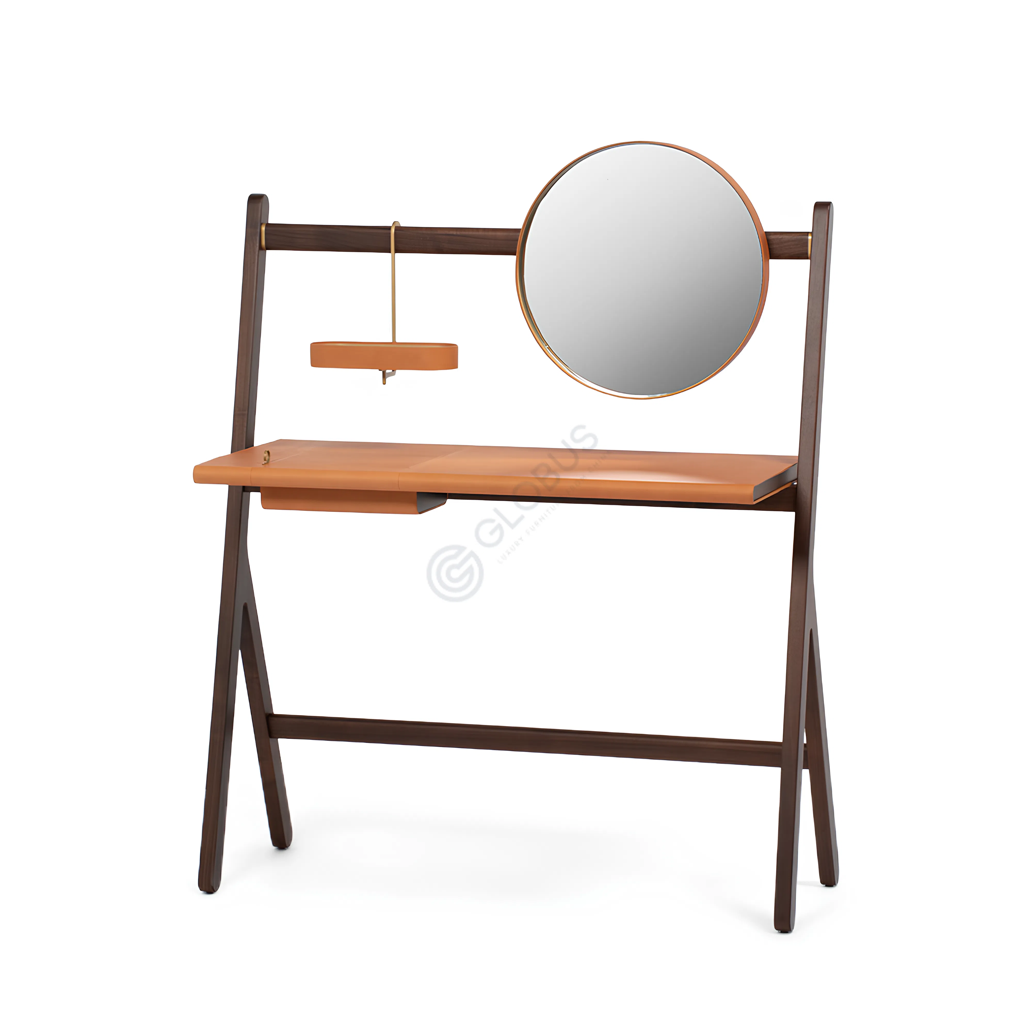 Отделка из шорно-седельной кожи подчеркивает исключительное внимание к деталям и добавляет тонкую ноту роскоши. Большая зеркальная поверхность позволяет удобно использовать его в интерьерах спальни, гостиной, прихожей или столовой. Практичная полка у основания обеспечивает дополнительное место для хранения аксессуаров или декора.