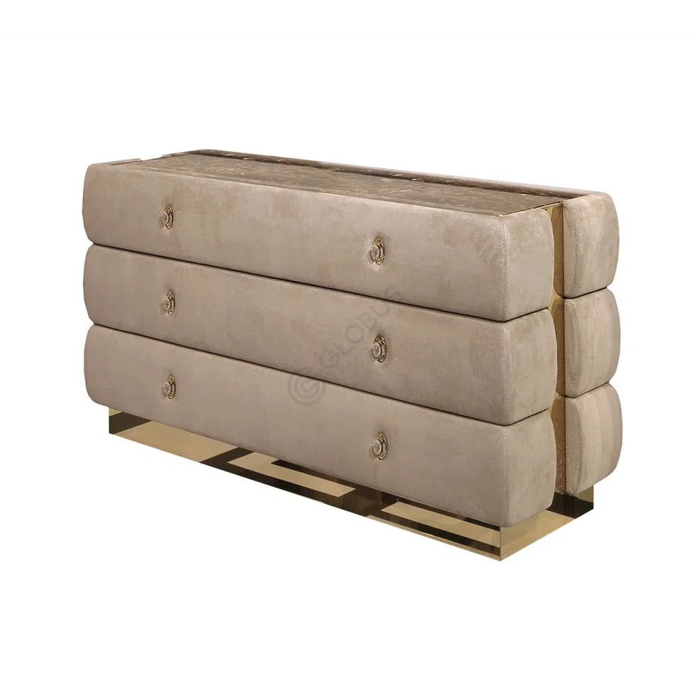 Ночной столик выполнен с использованием отборных материалов, демонстрирующих превосходное качество. Основание из нержавеющей стали обеспечивает устойчивость, в то время как каркас изготовлен из натурального дерева и прочной фанеры. Внешняя отделка представляет собой роскошный текстиль, который приятно дополняется элементами из полированного металла.