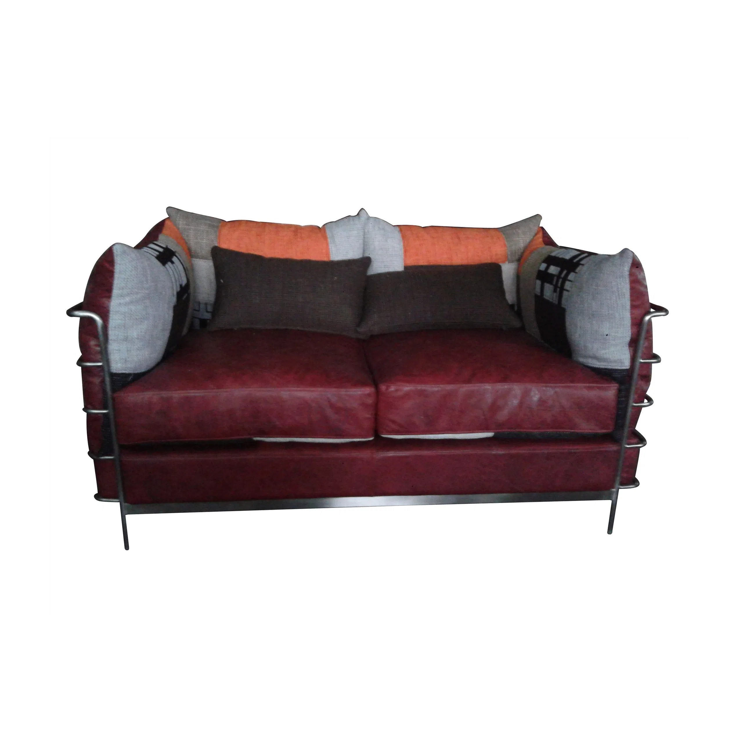 Основа конструкции создана из прочного металла, чьи чистые линии формируют характерный силуэт. Сиденье и спинка обтянуты качественной экокожей глубокого, насыщенного оттенка, приятной на ощупь и обладающей благородной фактурой. Дополнительный уют придают мягкие подушки и боковые элементы из текстиля с интересным узором, а внутренняя структура включает использование натурального дерева, что гарантирует долговечность и надежность этого предмета мебели.