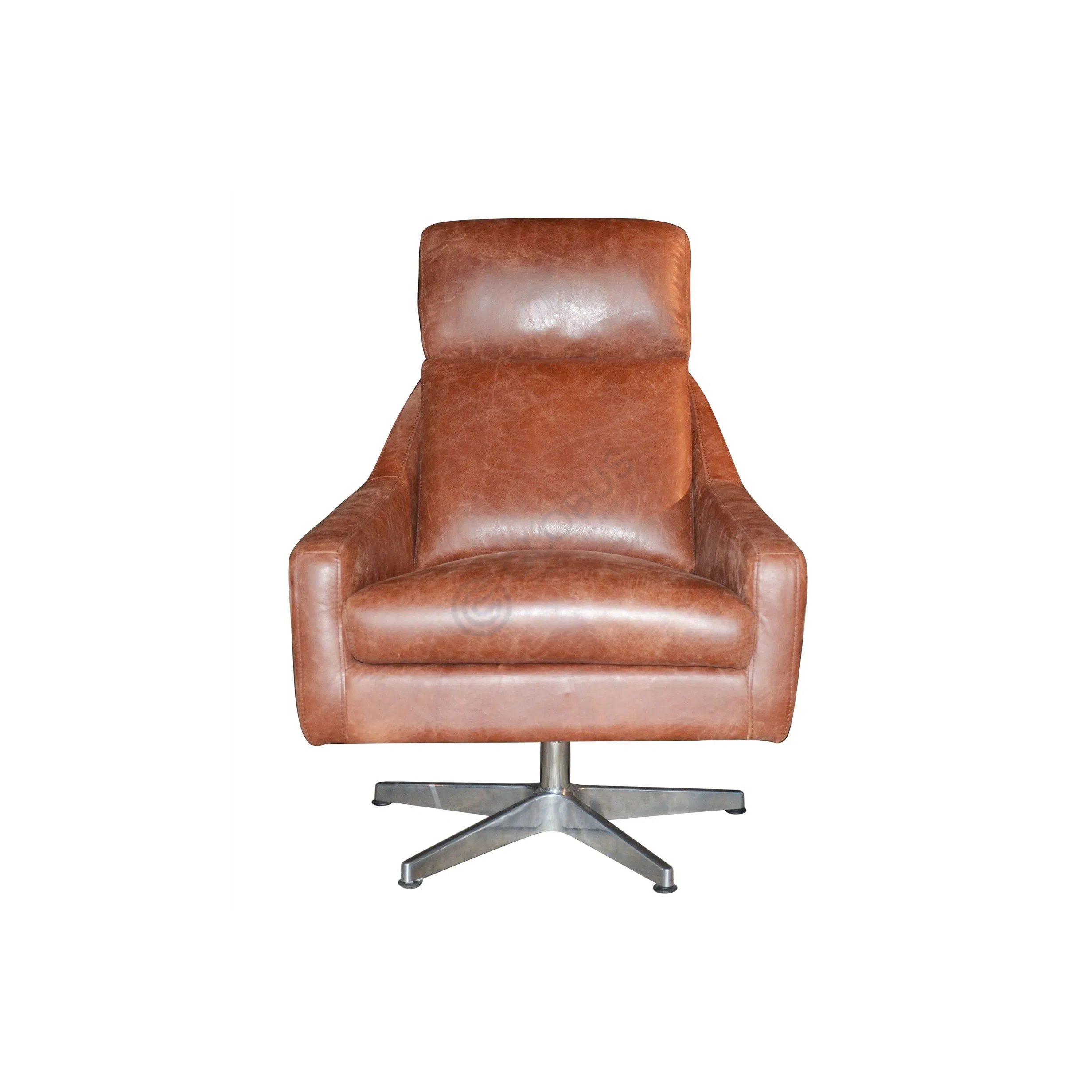 Его мягкое сиденье обтянуто приятной на ощупь экокожей теплого оттенка. Кажется, что материал имеет легкую фактуру, добавляющую глубины. Основание выполнено из металла, создавая прочную и стильную опору с блестящей поверхностью. Внутренняя структура, вероятно, включает фанеру, обеспечивая надежность и долговечность конструкции.