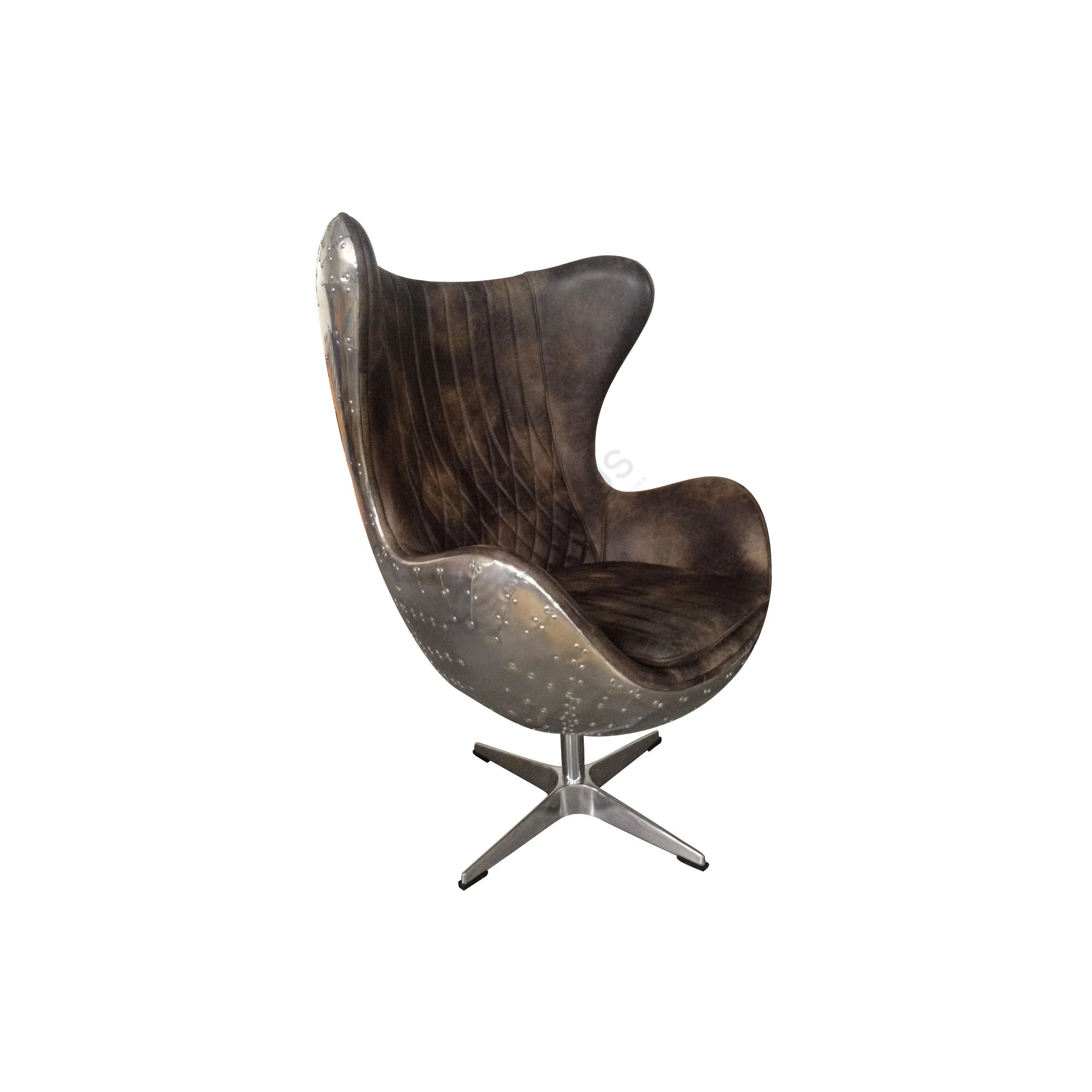 Основание и корпус предмета выполнены из прочной фанеры и металла, которые формируют устойчивую конструкцию. Внешняя часть чаши облицована листами полированного алюминия, украшенными множеством декоративных клепок. Это придает изделию уникальный вид, напоминающий элементы авиационного или винтажного индустриального оборудования.
