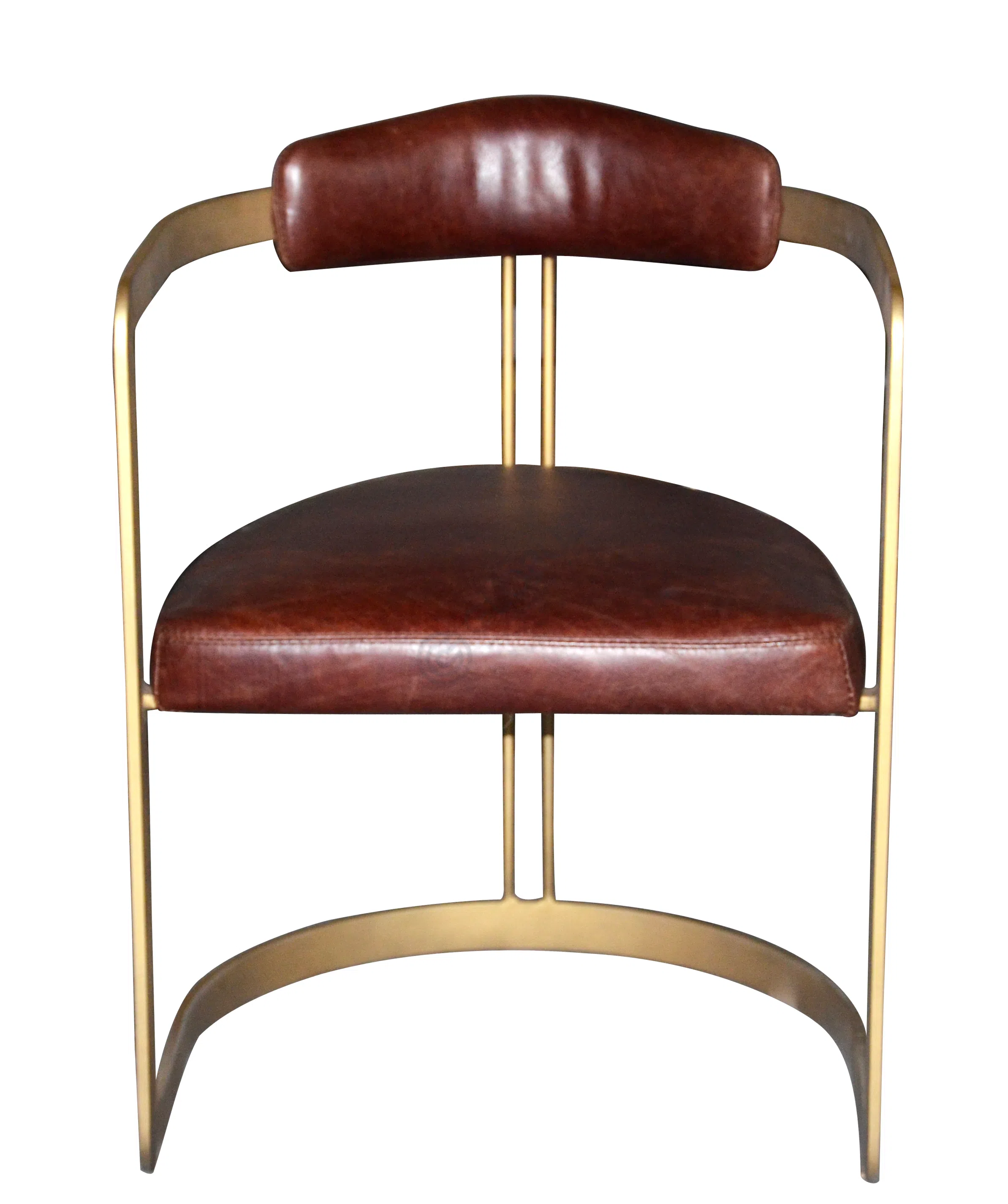 Каркас, выполненный из прочного металла с благородным золотистым оттенком, служит надежной основой и добавляет визуальной легкости благодаря своим изящным изгибам. Сиденье и спинка обиты высококачественной экокожей теплого коричневого цвета, обладающей приятной на ощупь фактурой. Внутренняя структура базируется на фанере, обеспечивая долговечность и сохранение формы.