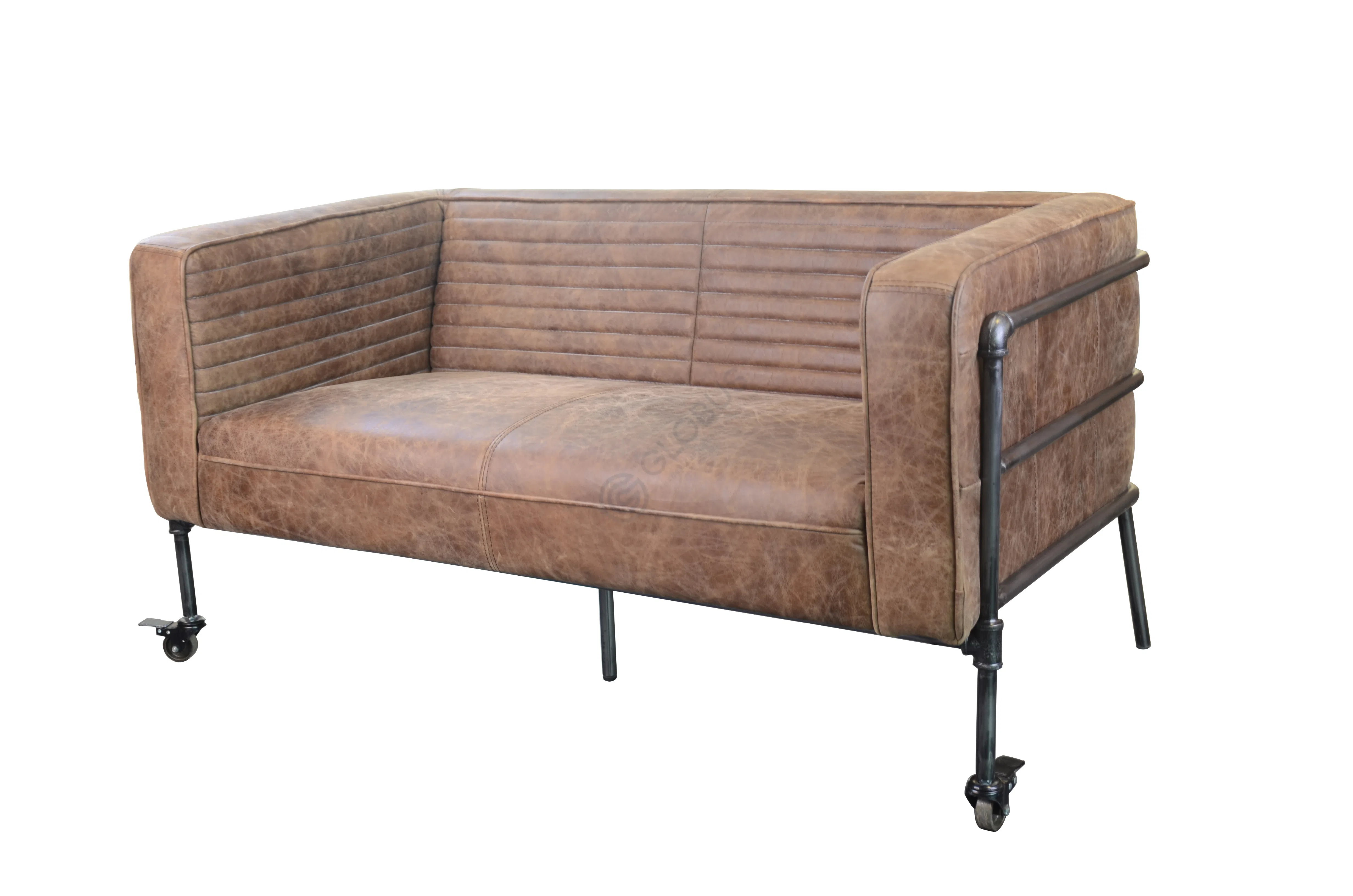 Обивка выполнена из качественной экокожи благородного оттенка, имитирующего винтажный эффект. Декоративная стежка придает текстурную выразительность спинке и боковинам. Прочный каркас из металла с характерными деталями трубчатой конструкции обеспечивает надежность и подчеркивает индустриальную эстетику. Внутренняя структура основана на использовании натурального дерева, добавляя теплоту и экологичность.
