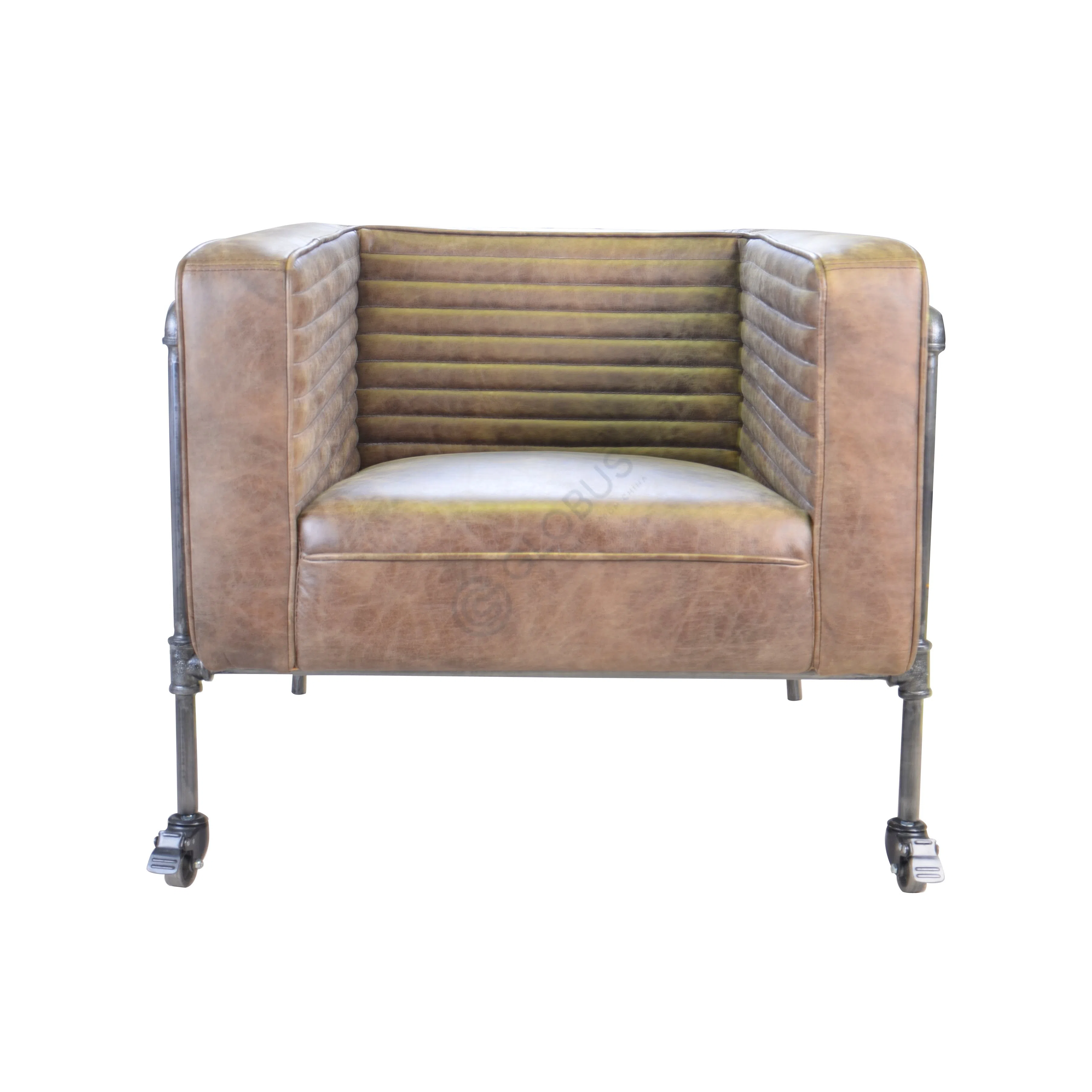 Его обивка выполнена из высококачественной экокожи с эффектом потертости, придающей поверхности винтажный вид и тактильную привлекательность. Каркас, частично видимый в подлокотниках и опорах, включает элементы из металла, стилизованные под водопроводные трубы, что является характерной чертой индустриального дизайна. Устойчивость конструкции обеспечивает основа из натурального дерева, а два передних колесика добавляют легкости облику и функциональности.