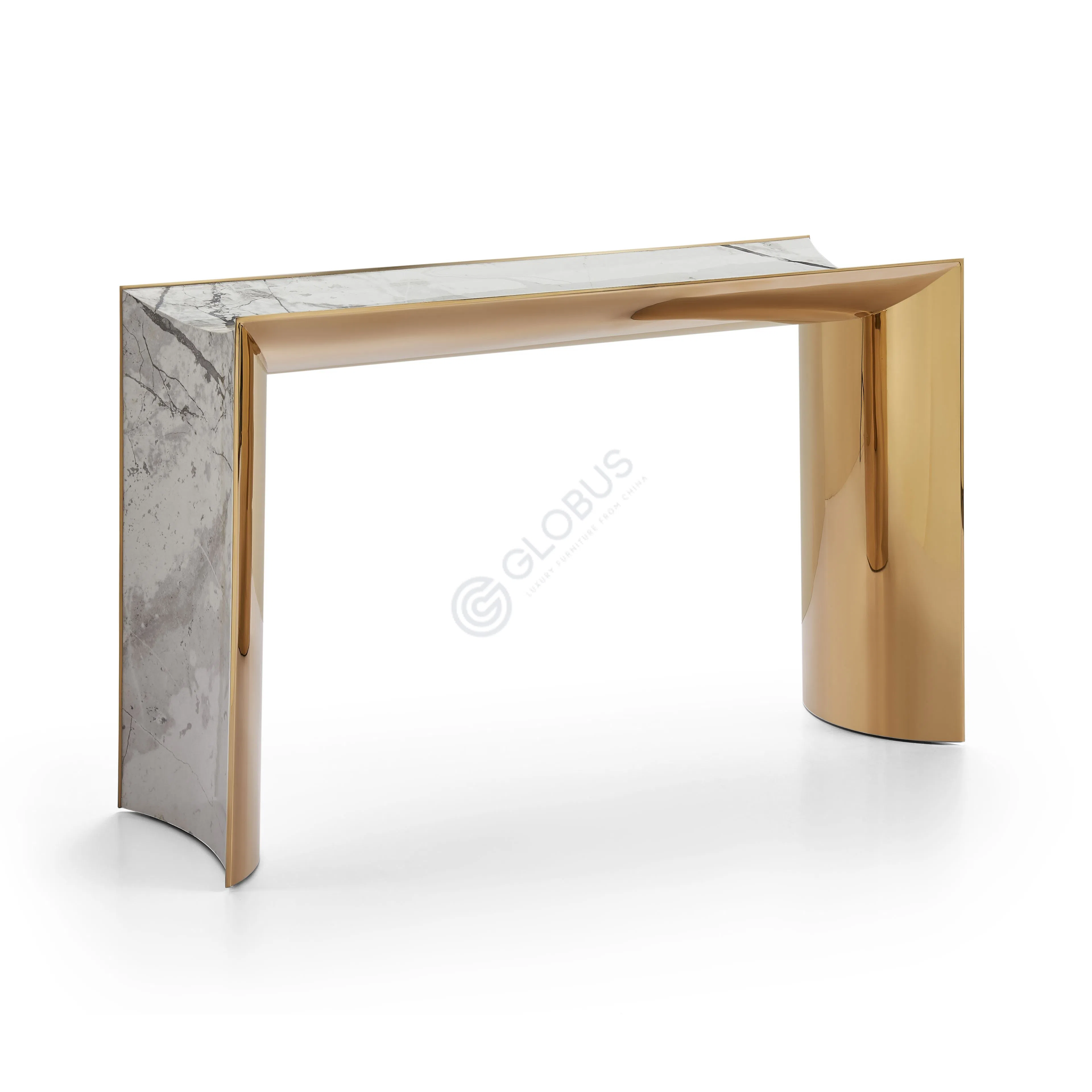 Основание выполнено из нержавеющей стали с теплым золотистым оттенком, подчеркивающим геометрию изделия. Форма ножек придает модели графичность и актуальный характер, сохраняя легкость в восприятии.